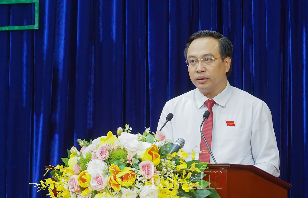 Đồng chí Nguyễn Anh Chức, Ủy viên BTV Tỉnh ủy, Phó Chủ tịch UBND tỉnh trình bày báo cáo tổng hợp kết quả giải quyết ý kiến, kiến nghị của cử tri đến thời điểm tiếp xúc cử tri trước kỳ họp thường lệ giữa năm 2022, HĐND tỉnh khóa XIX, nhiệm kỳ 2021-2026.