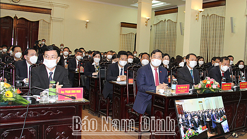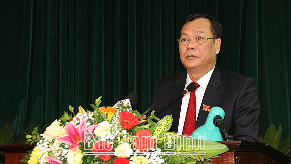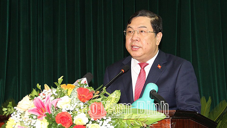 Thay mặt UBND tỉnh, đồng chí Phó Chủ tịch Thường trực UBND tỉnh Trần Anh Dũng đã trình bày báo cáo của UBND tỉnh về kết quả thực hiện nhiệm vụ phát triển kinh tế - xã hội năm 2021; mục tiêu, nhiệm vụ, giải pháp trọng tâm năm 2022. Thực hiện kế hoạch phát triển kinh tế - xã hội năm 2021 của tỉnh trong bối cảnh đại dịch COVID-19 bùng phát trở lại, đã tác động trực tiếp đến nhiều mặt của đời sống xã hội; song dưới sự lãnh đạo thống nhất của các cấp ủy Đảng, sự chỉ đạo linh hoạt, quyết liệt của chính quyền các cấp, sự giám sát của HĐND, sự phối hợp của Ủy ban MTTQ; hoạt động quyết liệt, chủ động của các sở, ngành, đoàn thể, cùng sự nỗ lực của toàn thể nhân dân, doanh nghiệp nên tình hình kinh tế - xã hội của tỉnh vẫn giữ được ổn định và phát triển so với cùng kỳ. Kinh tế duy trì mức tăng trưởng khá, chất lượng tăng trưởng được nâng lên; một số chỉ tiêu kinh tế tăng hơn so với bình quân chung cả nước. Trong đó, tổng sản phẩm GRDP ước tăng từ 7,7%-8,2%; chỉ số sản xuất công nghiệp ước tăng 14%; giá trị hàng xuất khẩu ước đạt 2.600 triệu USD, tăng 23,1% so với năm 2020; thu ngân sách đạt 6.325 tỷ đồng, vượt 11% dự toán… Công tác xây dựng Nông thôn mới tiếp tục được quan tâm triển khai thực hiện theo các tiêu chí nâng cao, kiểu mẫu; đến nay tỉnh ta đã có 78/204 ( đạt 38%) xã, thị trấn được công nhận đạt chuẩn nông thôn mới nâng cao. Chương trình mỗi xã một sản phẩm (OCOP) đạt được kết quả tích cực, vượt chỉ tiêu kế hoạch đề ra với 226 sản phẩm OCOP được công nhận đạt hạng từ 3 sao trở lên. Hệ thống kết cấu hạ tầng, kinh tế- xã hội tiếp tục được quan tâm đầu tư và tập trung chỉ đạo, đôn đốc thực hiện; nhiều công trình, dự án quan trọng đã hoàn thành và đang triển khai đến khi hoàn thành sẽ tạo diện mạo mới, động lực cho phát triển của tỉnh. Công tác xúc tiến và thu hút đầu tư đạt kết quả tích cực, tăng cả về số dự án và số vốn đăng ký đầu tư, trong đó có một số dự án đầu tư lớn như: Dự án Nhà máy gang thép số 1 Xuân Thiện Nam Định có tổng vốn đầu tư 66 nghìn tỷ đồng; Dự án Nhà máy cán thép Xuân Thiện Nghĩa Hưng có tổng vốn đầu tư 3.000 tỷ đồng; Dự án đầu tư xây dựng và kinh doanh hạ tầng Khu công nghiệp Mỹ Thuận có tổng vốn đầu tư 1.621 tỷ đồng. Tỉnh ta đã cơ bản kiểm soát tốt tình hình dịch COVID-19 và chuyển trạng thái sang thích ứng an toàn, linh hoạt, kiểm soát hiệu quả dịch trong tình hình mới. Hiệu lực, hiệu quả quản lý Nhà nước được nâng lên. Công tác cải cách hành chính, xây dựng chính quyền điện tử được tập trung chỉ đạo quyết liệt. Chỉ số hiệu quả quản trị và hành chính công năm 2020 của tỉnh thuộc nhóm 16 tỉnh cao nhất cả nước; Chỉ số đánh giá về chuyển đổi số năm 2020 đứng thứ 11/63 tỉnh, thành phố. Các lĩnh vực văn hóa, xã hội có bước phát triển. Ngành Giáo dục và Đào tạo tiếp tục đạt thành tích cao, đứng thứ 2 toàn quốc về điểm trung bình các môn thi tốt nghiệp THPT quốc gia năm 2021. An sinh xã hội được đảm bảo. An ninh chính trị, trật tự an toàn xã hội được giữ vững.