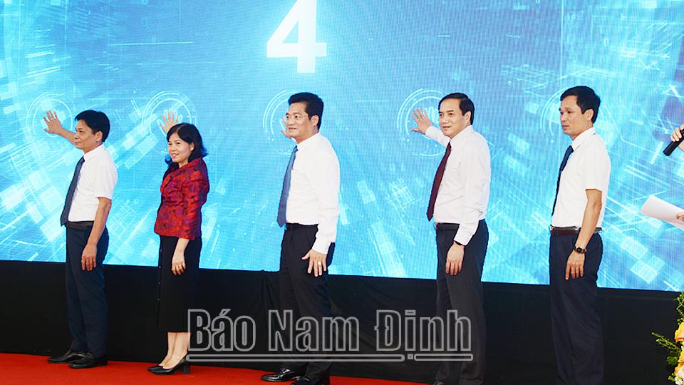 | Đồng chí Trần Anh Dũng, Phó Chủ tịch Thường trực UBND tỉnh; lãnh đạo các sở, ngành nhấn nút khai trương Tuần lễ giới thiệu sản phẩm nông sản an toàn năm 2023. |