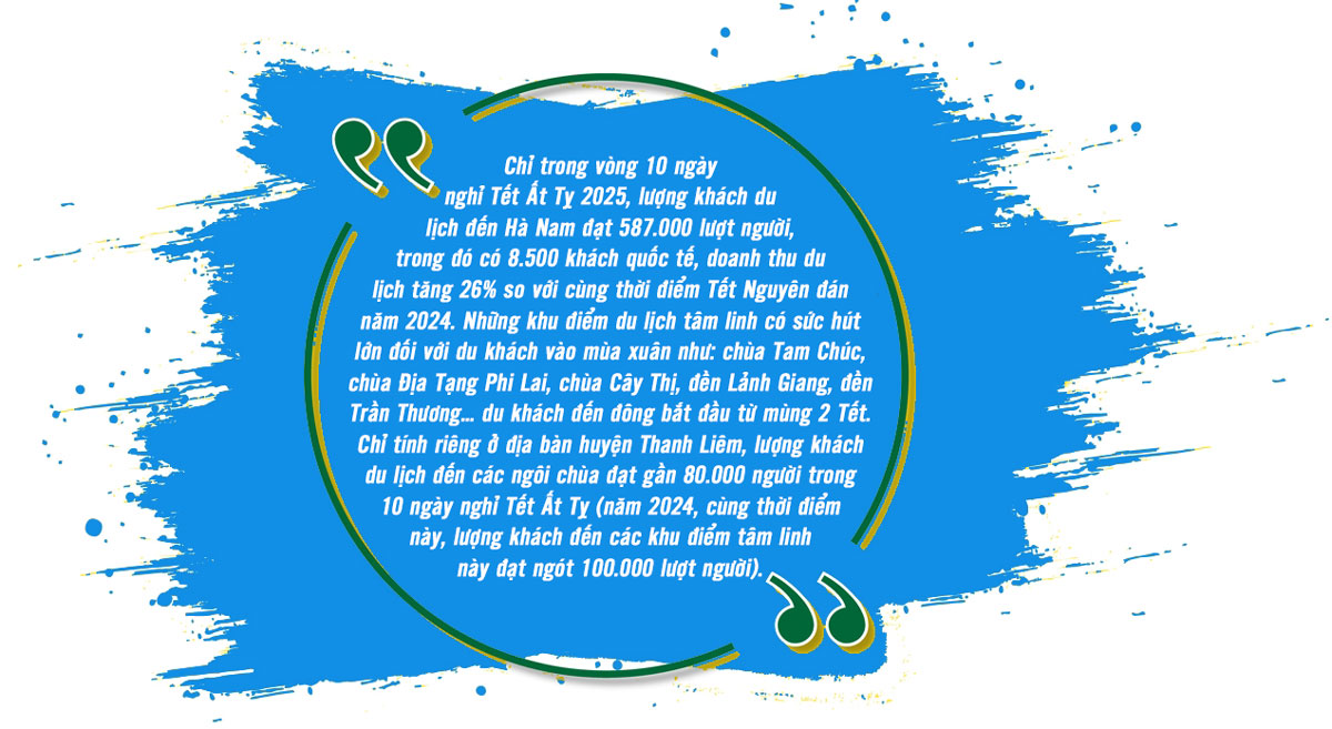 Thực tế, chỉ trong vòng 10 ngày nghỉ Tết Ất Tỵ 2025, lượng khách du lịch đến Hà Nam đạt 587.000 lượt người, trong đó có 8.500 khách quốc tế, doanh thu du lịch tăng 26% so với cùng thời điểm Tết Nguyên đán năm 2024. Những khu điểm du lịch tâm linh có sức hút lớn đối với du khách vào mùa xuân, như: chùa Tam Chúc, chùa Địa Tạng Phi Lai, chùa Cây Thị, đền Lảnh Giang, đền Trần Thương… du khách đến đông bắt đầu từ mùng 2 Tết. Chỉ tính riêng ở địa bàn huyện Thanh Liêm, lượng khách du lịch đến các ngôi chùa đạt gần 80.000 người trong 10 ngày nghỉ Tết Ất Tỵ (năm 2024, cùng thời điểm này, lượng khách đến các khu điểm tâm linh này đạt ngót 100.000 lượt người). Ngoài các dịch vụ du lịch phát triển theo, dịch vụ xe ôm chở khách vào chùa đã tạo việc làm và thu nhập cao cho hàng nghìn lao động nông thôn trong khu vực. Anh Đỗ Xuân Độ, một lái xe ôm tại chùa Địa Tạng Phi Lai (xã Liêm Sơn, huyện Thanh Liêm) cho biết, mỗi ngày làm việc tại khu vực chùa, anh cũng kiếm được trên dưới 500 nghìn đồng. So với năm ngoái, mức thu nhập hiện tại có kém hơn nhưng đó cũng là khoản tiền công không dễ kiếm với lao động tự do dịp “tháng ba ngày tám” này.