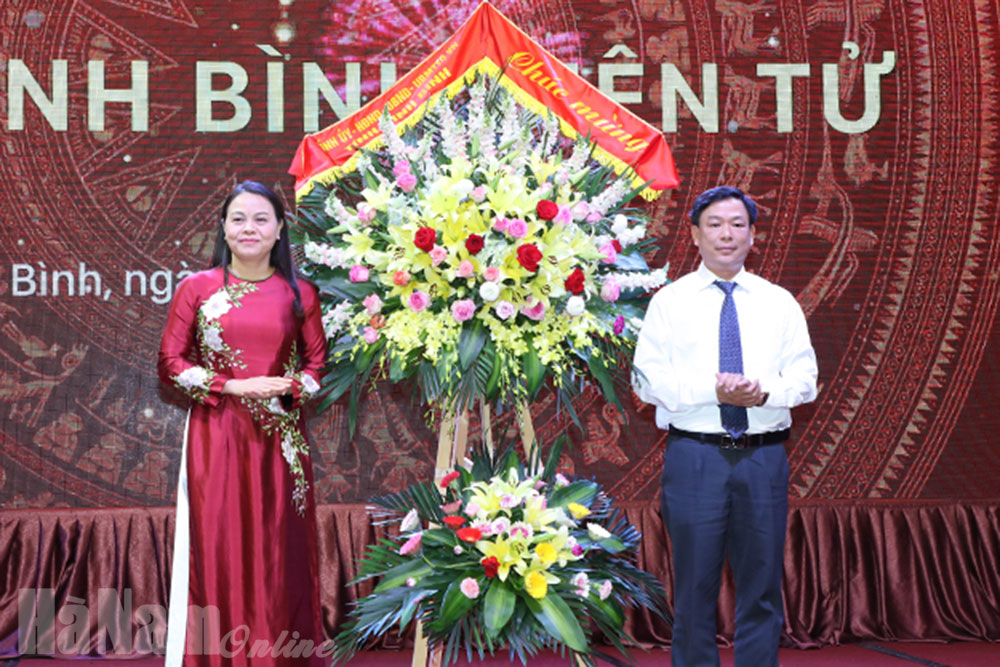 Đồng chí Nguyễn Thị Thu Hà, Ủy viên Trung ương Đảng, Bí thư Tỉnh ủy, Trưởng đoàn Đại biểu Quốc hội tỉnh tặng hoa, chúc mừng Báo Ninh Bình.Các đồng chí lãnh đạo tỉnh tham gia ấn nút khởi động, khai trương Báo Ninh Bình điện tử.