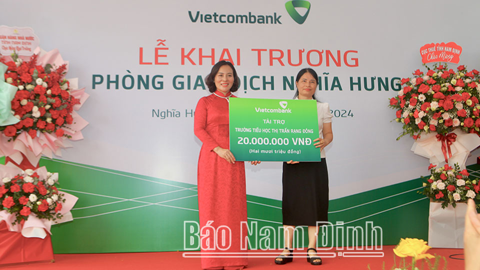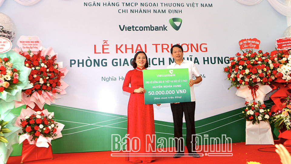 Nhân dịp khai trương, Vietcombank Nam Định đã trao tặng 50 triệu đồng ủng hộ đồng bào bị ảnh hưởng bởi cơn bão số 3 tại địa bàn huyện Nghĩa Hưng; ủng hộ Trường Tiểu học thị trấn Rạng Đông 1 bộ máy tính và 20 triệu đồng. Trước đó, Vietcombank Nam Định đã cùng các mạnh thường quân trao tổng trị giá 300 triệu đồng đến tận tay người dân di dời tránh bão trên địa bàn tỉnh./.