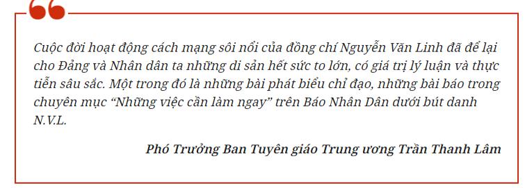 Cuộc đời hoạt động cách mạng sôi nổi của đồng chí Nguyễn Văn Linh đã để lại cho Đảng và Nhân dân ta những di sản hết sức to lớn, có giá trị lý luận và thực tiễn sâu sắc. Một trong đó là những bài phát biểu chỉ đạo, những bài báo trong chuyên mục “Những việc cần làm ngay” trên Báo Nhân Dân dưới bút danh N.V.L.