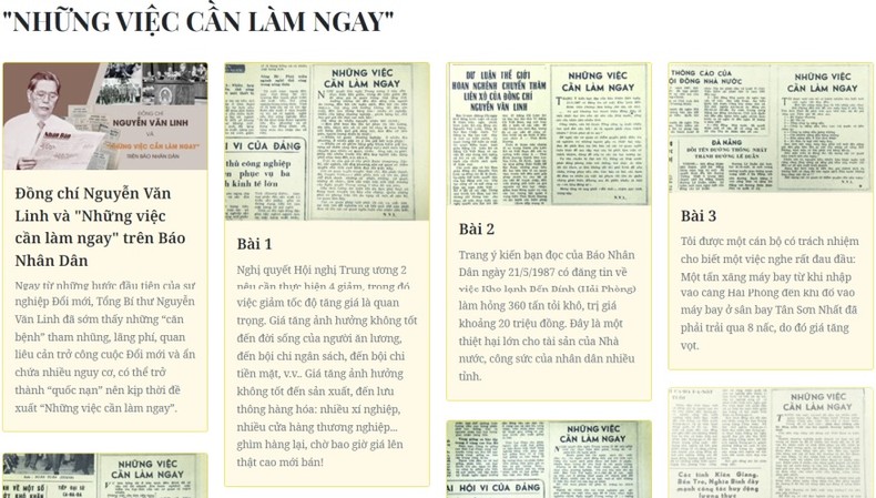 Trang thông tin gồm 2 chuyên mục chính: “Những việc cần làm ngay” và “Sức sống những việc cần làm ngay”. Trên nền tảng công nghệ hiện đại, thiết kế trang trọng, trực quan, chuyên mục “Những việc cần làm ngay” đã số hóa kho tư liệu đặc biệt với 31 bài báo của đồng chí Nguyễn Văn Linh đăng trên Báo Nhân Dân trong chuyên mục Những việc cần làm ngay (số đầu tiên 25/5/1987, số cuối cùng ngày 28/9/1990). Độc giả có thể trải nghiệm chân thực các bài báo gốc song song với các bài báo được trình bày hiện đại, đa phương tiện dưới hình thức e-magazine.