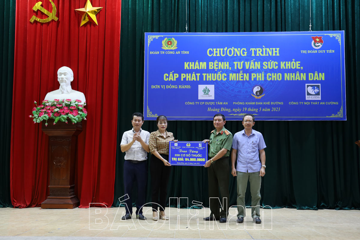 Thiết thực chào mừng kỷ niệm 133 năm Ngày sinh Chủ tịch Hồ Chí Minh và hưởng ứng Ngày hội Thầy thuốc trẻ làm theo lời Bác, tình nguyện vì sức khỏe cộng đồng năm 2023, chiều 19/5, tại phường Hoàng Đông, Thị đoàn Duy Tiên phối hợp với Đoàn Thanh niên Công an tỉnh tổ chức chương trình khám bệnh, tư vấn sức khỏe, cấp phát thuốc cho nhân dân trên địa bàn. Đại diện lãnh đạo Công an tỉnh, Thị ủy Duy Tiên, phường Hoàng Đông đã đến dự chương trình.
