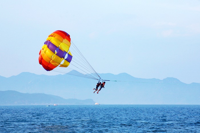Bãi biển Nha Trang, Phan Thiết Với địa hình phía sau là núi, phía trước biển rộng và thoáng, bãi biển Nha Trang rất phù hợp để chơi dù lượn. Tuy nhiên, hoạt động chơi dù lượn tại Nha Trang có chút khác biệt đó là một cano sẽ chạy trên biển với tốc độ cao để kéo chiếc dù của du khách bung mở và bay lên cao ngay trên biển.