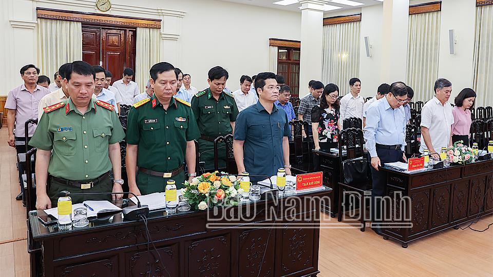 | Các đồng chí lãnh đạo tỉnh và các đại biểu tại điểm cầu tỉnh Nam Định dành một phút mặc niệm tưởng nhớ các nạn nhân bị thiệt mạng do Bão Yagi và lũ lụt gây ra. |