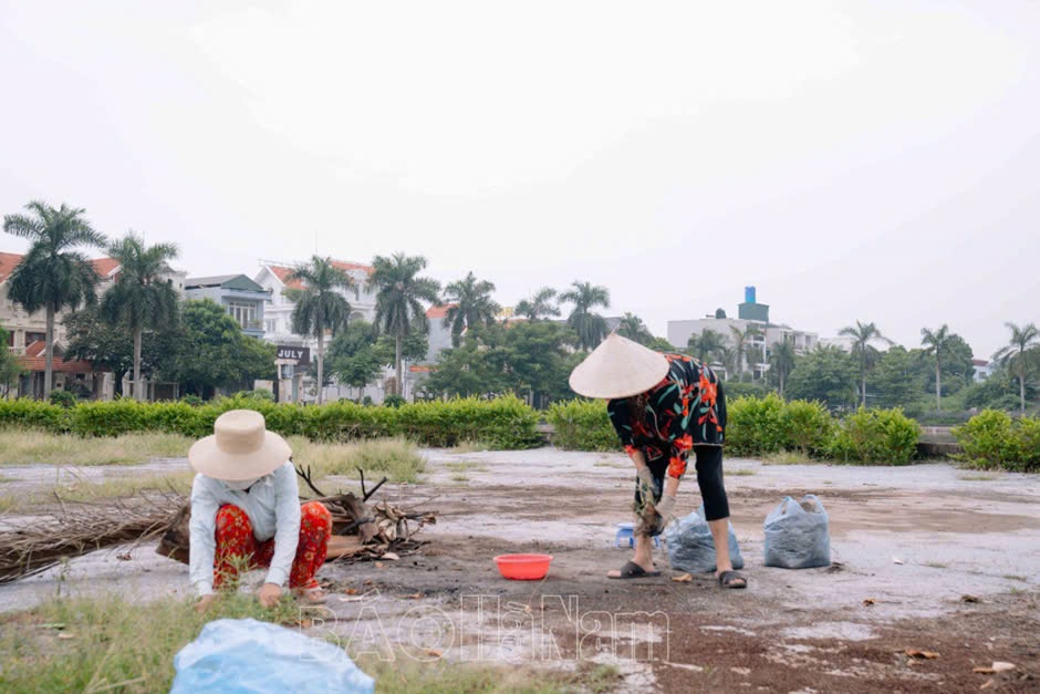 Người dân tổ dân phố số 12, phường Trần Hưng Đạo (Phủ Lý) dọn vệ sinh, nhặt những cành cây, lá cây và dọn bùn, đất không để mắc vào cống thoát nước. Ảnh: Hà Trang