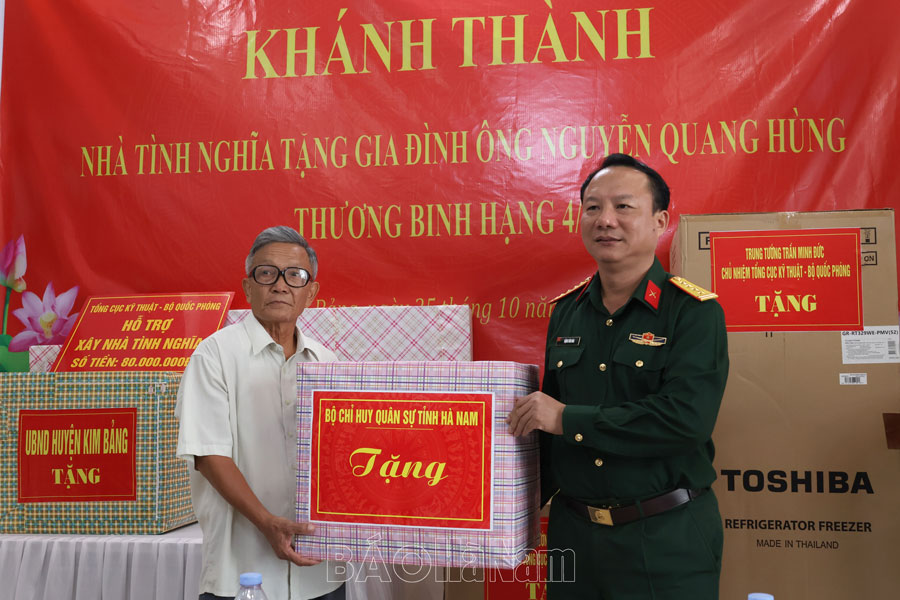 Nhân dịp khánh thành nhà, Tổng cục Kỹ thuật, Bộ Quốc Phòng và cá nhân Trung tướng Trần Minh Đức, Chủ nhiệm Tổng cục Kỹ thuật; thủ trưởng Bộ CHQS tỉnh; lãnh đạo huyện Kim Bảng và cấp ủy, chính quyền xã Nhật Tân đã tặng gia đình ông Nguyễn Quang Hùng nhiều phần quà giá trị, có ý nghĩa thiết thực phục vụ cuộc sống sinh hoạt của gia đình.