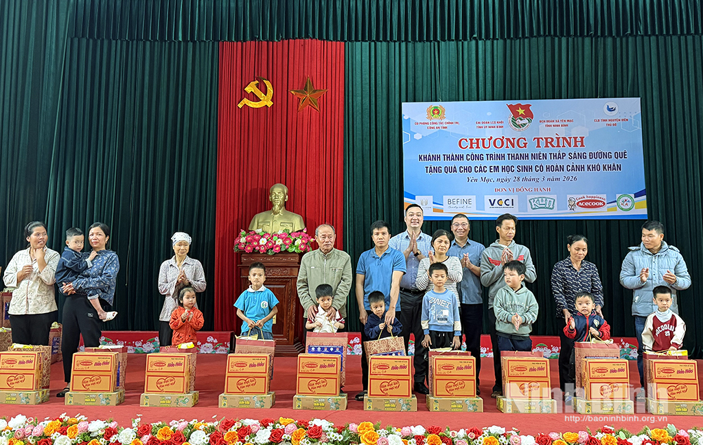 Chiều 28/3, Chi đoàn Liên cơ quan Tỉnh uỷ phối hợp với Chi đoàn Phòng Công tác chính trị-Công an tỉnh, Câu lạc bộ tình nguyện viên thủ đô, Đoàn xã Yên Mạc tổ chức chương trình khánh thành công trình thắp sáng đường quê và tặng quà cho các em học sinh có hoàn cảnh khó khăn.