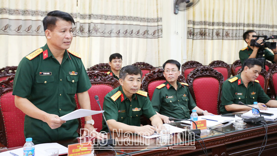 | Lãnh đạo Đảng ủy Bộ CHQS tỉnh Nam Định báo cáo kết quả thực hiện phong trào TĐQT với Đoàn khảo sát. |