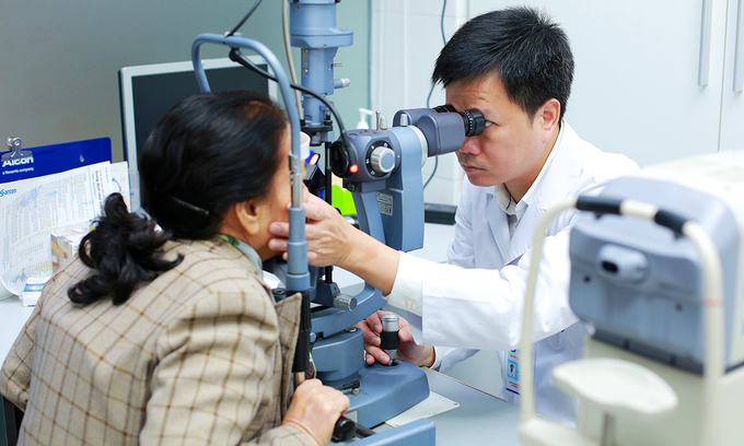 Bác sĩ Lê Mạnh Đức, Phó giám đốc, Trưởng khoa Mắt Bệnh viện Bưu điện đang khám mắt cho bệnh nhân. Ảnh: Bệnh viện cung cấp