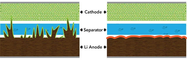 | Các sợi dendrite có thể phá lớp ngăn giữa hai cực, khiến pin chập và gây cháy, nổ. |