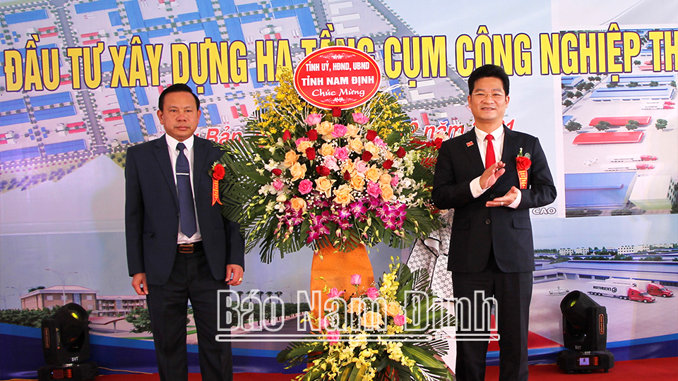 | Đồng chí Trần Anh Dũng, Ủy viên Ban TVTU, Phó Chủ tịch Thường trực UBND tỉnh tặng hoa, chúc mừng nhà đầu tư. |