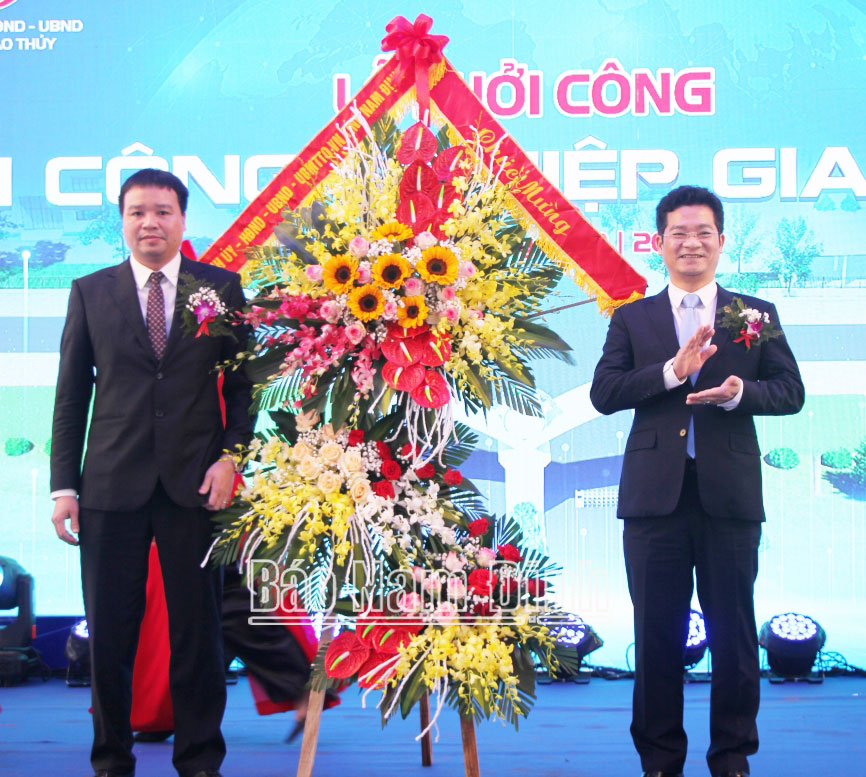 | Đồng chí Phó Chủ tịch Thường trực UBND tỉnh Trần Anh Dũng tặng hoa, chúc mừng nhà đầu tư. |