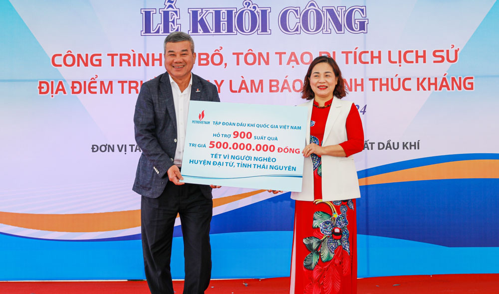 Nhân dịp này, Tập đoàn Dầu khí Việt Nam đã trao tặng 900 suất quà (với tổng trị giá 500 triệu đồng) ủng hộ Quỹ vì người nghèo huyện Đại Từ để chăm lo đời sống cho các gia đình có hoàn cảnh khó khăn trong dịp Tết Nguyên đán Giáp Thìn 2024. Hội Nhà báo Việt Nam trao tặng 10 suất quà cho các hộ nghèo tại xã Tân Thái.