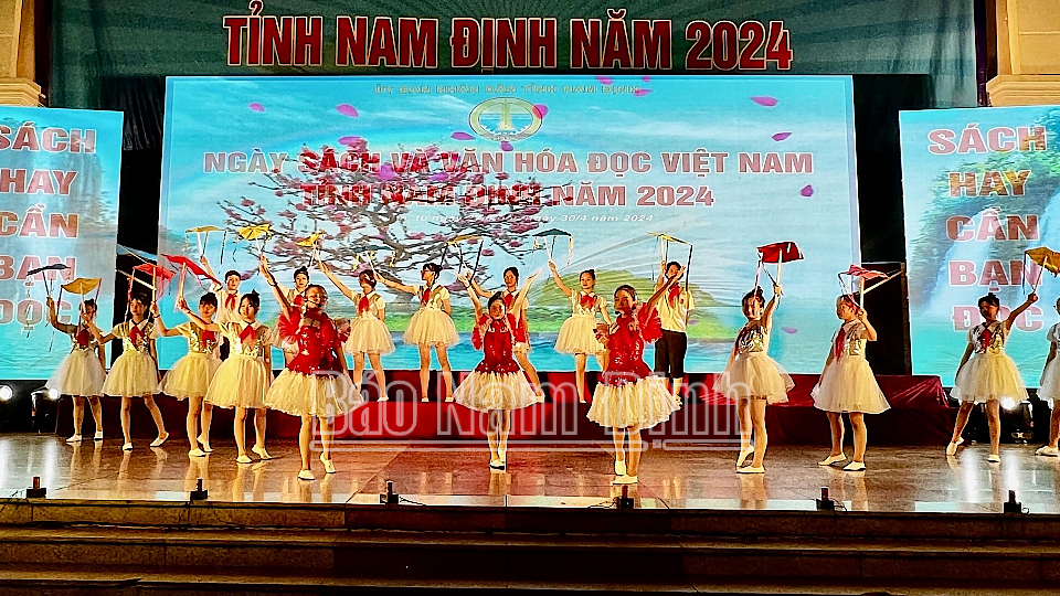 | Học sinh Trường THCS Quang Trung (thành phố Nam Định) biểu diễn một tiết mục văn nghệ trong đêm khai mạc Ngày Sách và Văn hóa đọc Việt Nam tỉnh Nam Định năm 2024. |