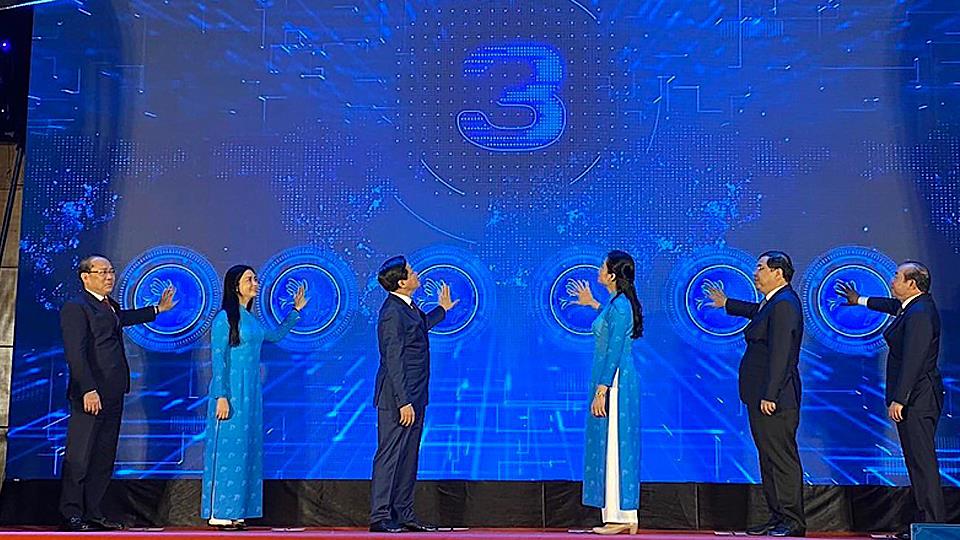 | Các đồng chí: Lê Minh Khái, Bí thư Trung ương Đảng, Phó Thủ tướng Chính phủ; Phạm Gia Túc, Ủy viên BCH Trung ương Đảng, Bí thư Tỉnh ủy và các đại biểu thực hiện nghi thức bấm nút khởi động Đề án 01. |