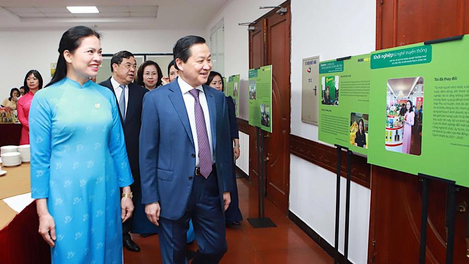 | Phó Thủ tướng Chính phủ Lê Minh Khái và Chủ tịch Hội LHPN Việt Nam Hà Thị Nga tham quan triển lãm của phụ nữ khởi nghiệp trưng bày tại Hội nghị. |
