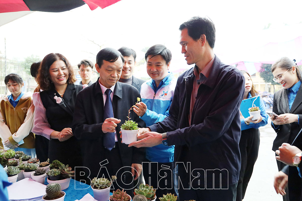 Các đại biểu tham gia trồng cây và tham quan gian hàng đổi rác lấy cây xanh của đoàn viên thanh niên Trường THPT C Kim Bảng.