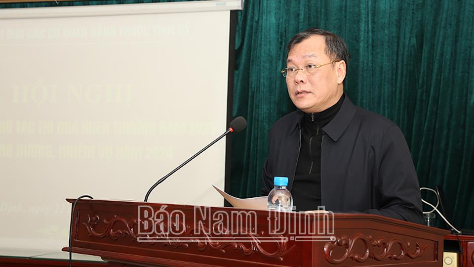 Phát biểu chỉ đạo hội nghị, đồng chí Phó Bí thư Thường trực Tỉnh ủy Lê Quốc Chỉnh thông tin khái quát tình hình kinh tế - xã hội của tỉnh năm 2023 và khẳng định những thành tích, kết quả đạt được của tỉnh có đóng góp rất quan trọng của các cơ quan Đảng thuộc Tỉnh ủy. Đồng thời đề nghị Khối thi đua các cơ quan Tỉnh ủy tổ chức phát động các phong trào thi đua năm 2024 thiết thực, nhằm nâng cao hơn nữa nhận thức của cán bộ, đảng viên trong Khối về vị trí, vai trò và tầm quan trọng của công tác thi đua, khen thưởng; khơi dậy tinh thần tự giác, tích cực, sáng tạo của cán bộ, công chức, viên chức, người lao động. Phát huy vai trò tiên phong, gương mẫu của cán bộ, đảng viên, nhất là người đứng đầu, nỗ lực, phấn đấu hoàn thành vượt mức các chỉ tiêu trong kế hoạch của từng cơ quan, đơn vị, với năng suất, chất lượng và hiệu quả cao nhất. Tiếp tục tăng cường học tập và làm theo tư tưởng, đạo đức, phong cách Hồ Chí Minh gắn với công tác xây dựng, chỉnh đốn Đảng và các Quy định về nêu gương. Bám sát những định hướng nhiệm vụ năm 2024 của Ban TVTU, BCH Đảng bộ tỉnh và các chỉ đạo của tỉnh trong công tác thi đua khen thưởng để xây dựng các chương trình, kế hoạch thi đua gắn với việc thực hiện các nhiệm vụ chính trị của cơ quan, đơn vị. Tập trung đổi mới, nâng cao chất lượng các phong trào thi đua cả về nội dung và hình thức. Làm tốt công tác khen thưởng theo hướng công khai, minh bạch, thực chất, chính xác, kịp thời, đúng đối tượng. Đẩy mạnh công tác tuyên truyền, tôn vinh, nhân rộng các điển hình tiên tiến, gương người tốt, việc tốt tại mỗi cơ quan, đơn vị. Nâng cao chất lượng hoạt động của Hội đồng thi đua - khen thưởng, đồng thời tăng cường công tác kiểm tra, giám sát việc thực hiện nhiệm vụ thi đua, khen thưởng ở từng cơ quan, đơn vị.