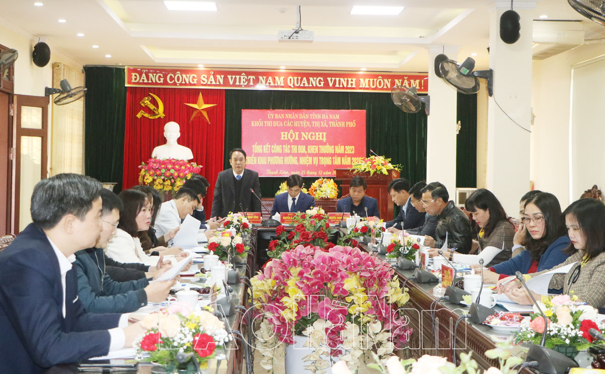 Chiều 25/12, tại huyện Thanh Liêm, Khối thi đua các huyện, thị xã, thành phố tổ chức hội nghị tổng kết công tác thi đua, khen thưởng (TĐKT) năm 2023, triển khai phương hướng, nhiệm vụ trọng tâm năm 2024. Dự, chỉ đạo hội nghị có đồng chí Nguyễn Anh Chức, Ủy viên BTV Tỉnh ủy, Phó Chủ tịch Thường trực UBND tỉnh.