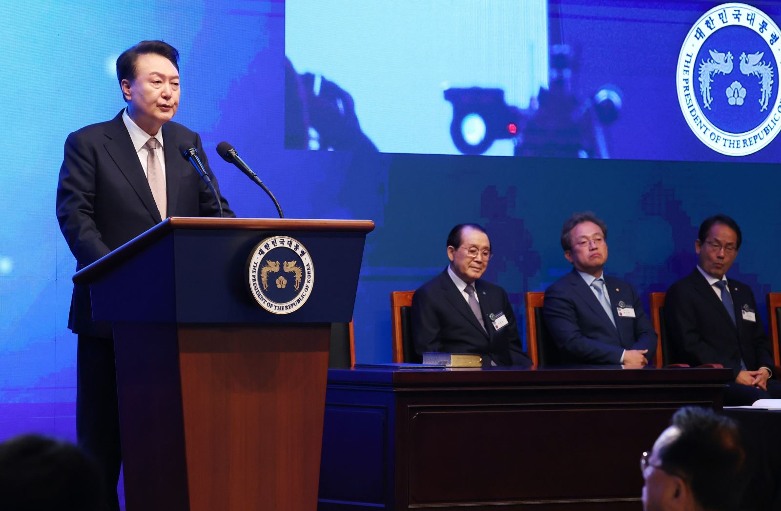 Tổng thống Hàn Quốc Yoon Suk Yeol (trái) phát biểu tại một sự kiện ở Seoul ngày 22/11/2024. Ảnh: YONHAP/TTXVN