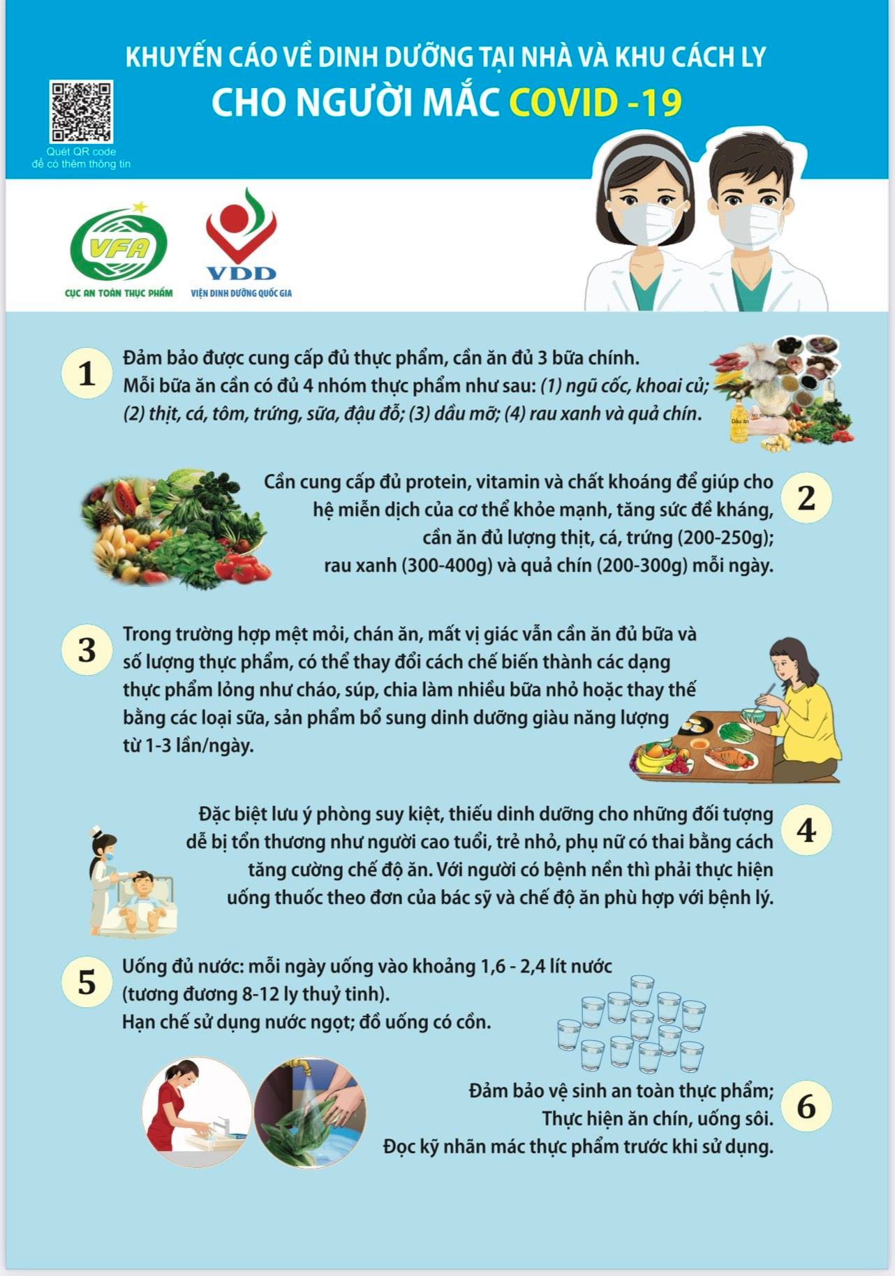 Để bảo đảm dinh dưỡng tại nhà và khu cách ly cho người mắc Covid-19, Bộ Y tế (Cục An toàn thực phẩm) phối hợp với Viện Dinh dưỡng Quốc gia đã xây dựng những hướng dẫn dinh dưỡng cụ thể.