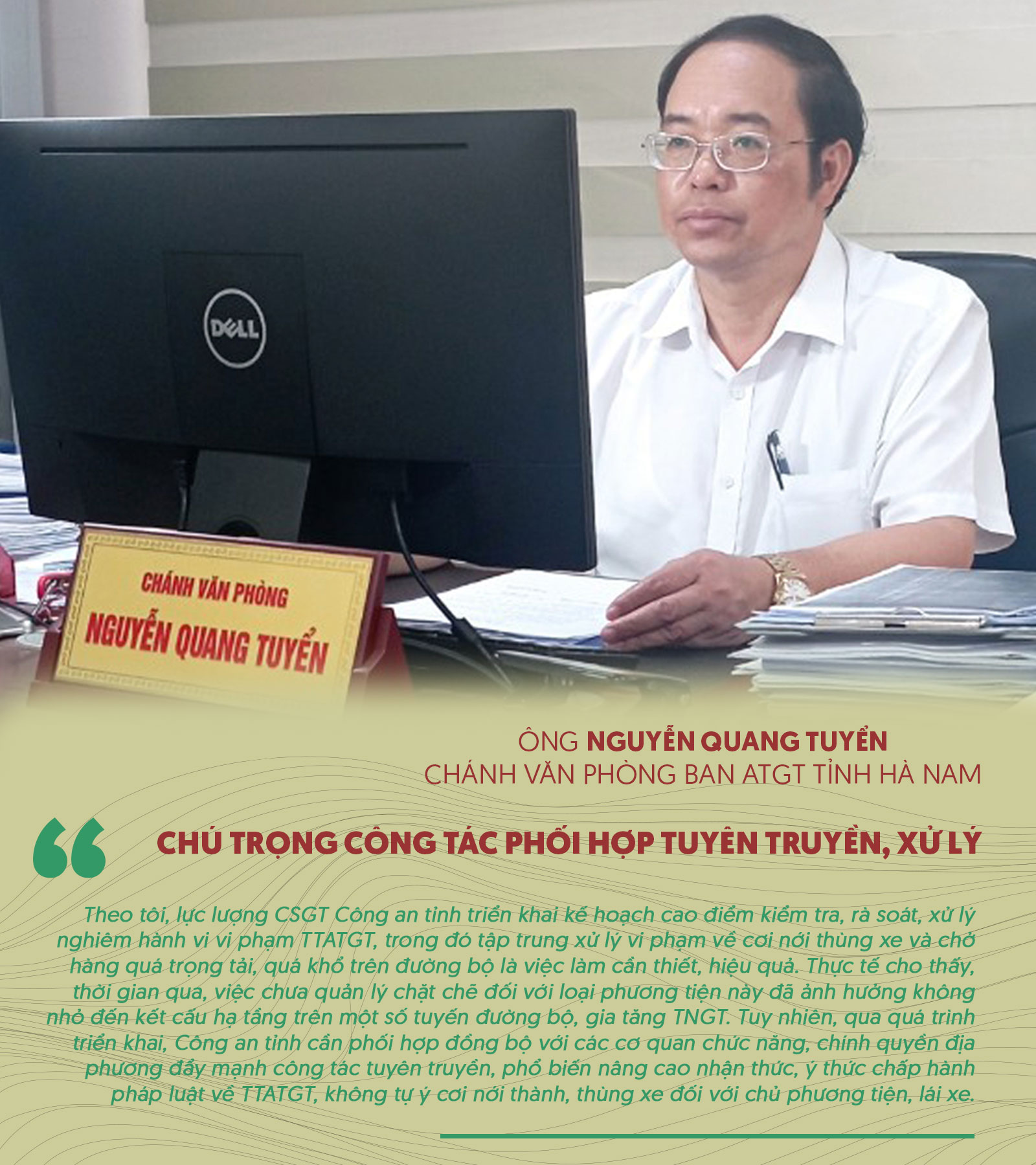 Theo thống kê từ ngành chức năng, trên địa bàn tỉnh Hà Nam hiện có 92 mỏ khai thác đất đá, trên 120 doanh nghiệp kinh doanh vận tải với gần 2 nghìn phương tiện ô tô tải hoạt động. Đặc biệt, số phương tiện chở cát, đá thường xuyên hoạt động trên một tuyến đường chính, dẫn đến tiềm ẩn nhiều nguy cơ gây TNGT. Thực hiện Kế hoạch 299 của Bộ Công an, Kế hoạch 1164 của Giám đốc Công an tỉnh, Phòng CSGT Công an tỉnh đã tổ chức ra quân, triển khai đồng bộ các biện pháp bảo đảm trật tự an toàn giao thông (TTATGT), kịp thời phòng ngừa, phát hiện, ngăn chặn, tập trung xử lý nghiêm những hành vi vi phạm là nguyên nhân trực tiếp dẫn đến TNGT, trong đó có chuyên đề tập trung xử lý vi phạm về cơi nới thành thùng xe; chở hàng quá trọng tải trên đường bộ; phương tiện giao thông đường thủy chở quá vạch dấu mớn nước an toàn; hàng hóa không hóa đơn, chứng từ; cảng, bến thủy nội địa không phép...