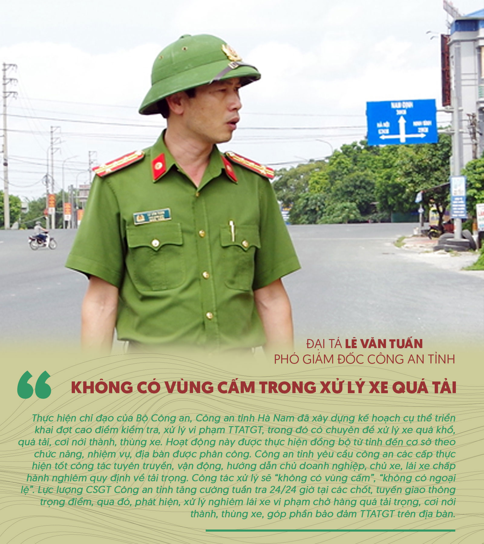 Việc “cắm chốt”, thành lập các trạm cân kiểm soát tải trọng không chỉ tập trung ở những địa phương, đơn vị có nguồn khai thác VLXD cũng như những tuyến giao thông trọng điểm thường xuyên có lưu lượng phương tiện vận tải tham gia đông đúc mà còn được triển khai đồng bộ, quyết liệt tại nhiều địa phương trên địa bàn tỉnh. Thượng tá Trần Quốc Huy, Phó Trưởng Phòng CSGT Công an tỉnh cho biết: Trước đây, việc kiểm soát tải trọng chủ yếu tập trung ở một số tuyến: QL1A, QL21A, QL21B, QL38, QL38B, đường tránh TP Phủ Lý... Tuy nhiên, sau khi thực hiện đợt cao điểm TTKS xử lý nghiêm xe chở hàng quá tải trọng, cơi nới thành, thùng xe, ngoài thành lập 6 chốt kiểm soát, lực lượng CSGT Công an tỉnh còn thành lập các tổ tuần tra lưu động; phối hợp lực lượng Cảnh sát cơ động thực hiện kiểm tra tải trọng 24/24h trong ngày theo chiều từ mỏ, bến bãi đi ra. Sự tham gia của lực lượng Cảnh sát cơ động nhằm bảo đảm an ninh trật tự đề phòng những trường hợp chống đối khi chúng tôi dừng xe để kiểm tra tải trọng. Ngoài ra, lãnh đạo Phòng CSGT Công an tỉnh còn lập thêm 1 tổ công tác đặc biệt để tuần tra, đôn đốc, nhắc nhở, hướng dẫn, hỗ trợ các tổ trong toàn tuyến.