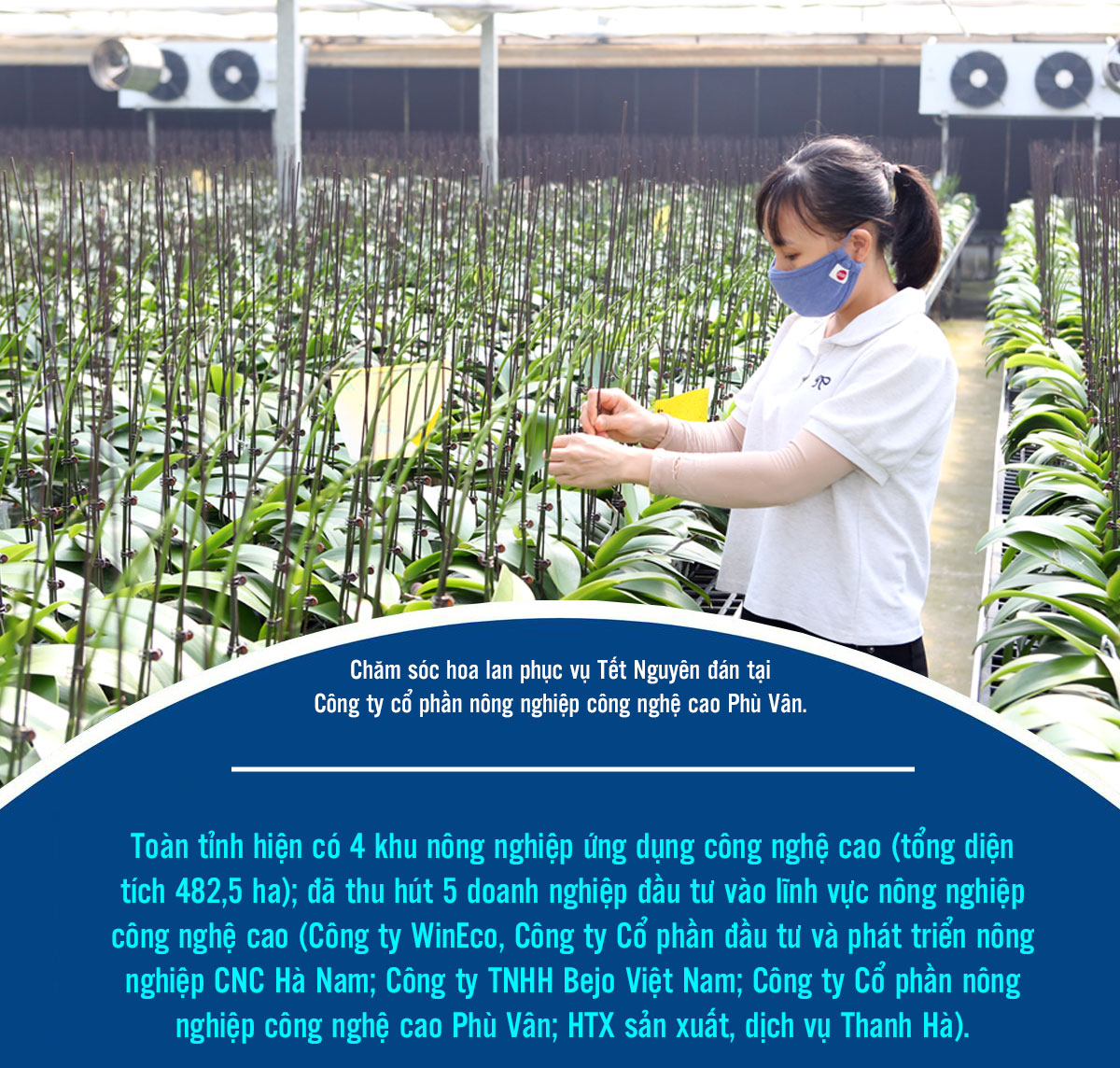 Mặc dù, chỉ chiếm 6,5% trong cơ cấu kinh tế của tỉnh, nhưng nông nghiệp vẫn được xác định là một trong những trụ đỡ an sinh quan trọng của nền kinh tế trong giai đoạn phát triển mới. Vì vậy, ngay sau khi Nghị quyết 15-NQ/TU, ngày 15/9/2021 của Tỉnh ủy khóa XX về đẩy mạnh cơ cấu lại ngành nông nghiệp, phát triển kinh tế nông thôn gắn với xây dựng nông thôn mới (NTM) bền vững, NTM nâng cao, NTM kiểu mẫu tỉnh Hà Nam giai đoạn 2021-2025, định hướng đến năm 2030 được ban hành, ngành nông nghiệp đã chủ động xây dựng, triển khai hiệu quả các chương trình, đề án trọng tâm, trọng điểm; thúc đẩy nhanh quá trình chuyển dịch cơ cấu mùa vụ, cơ cấu cây trồng, vật nuôi; từng bước thực hiện cơ giới hóa sản xuất nông nghiệp; liên kết sản xuất nông sản sạch hàng hóa; thu hút doanh nghiệp đầu tư sản xuất cây trồng hàng hóa chất lượng cao; ứng dụng tiến bộ khoa học công nghệ cao vào sản xuất; hình thành các vùng sản xuất hàng hóa tập trung; tạo chuỗi giá trị trong sản xuất nông nghiệp. Cùng với chương trình xây dựng NTM, chương trình OCOP năm 2024 cũng được triển khai hiệu quả. Hiện toàn tỉnh có 130 sản phẩm OCOP đạt 3 sao trở lên (trong đó 17 sản phẩm đạt hạng 4 sao).