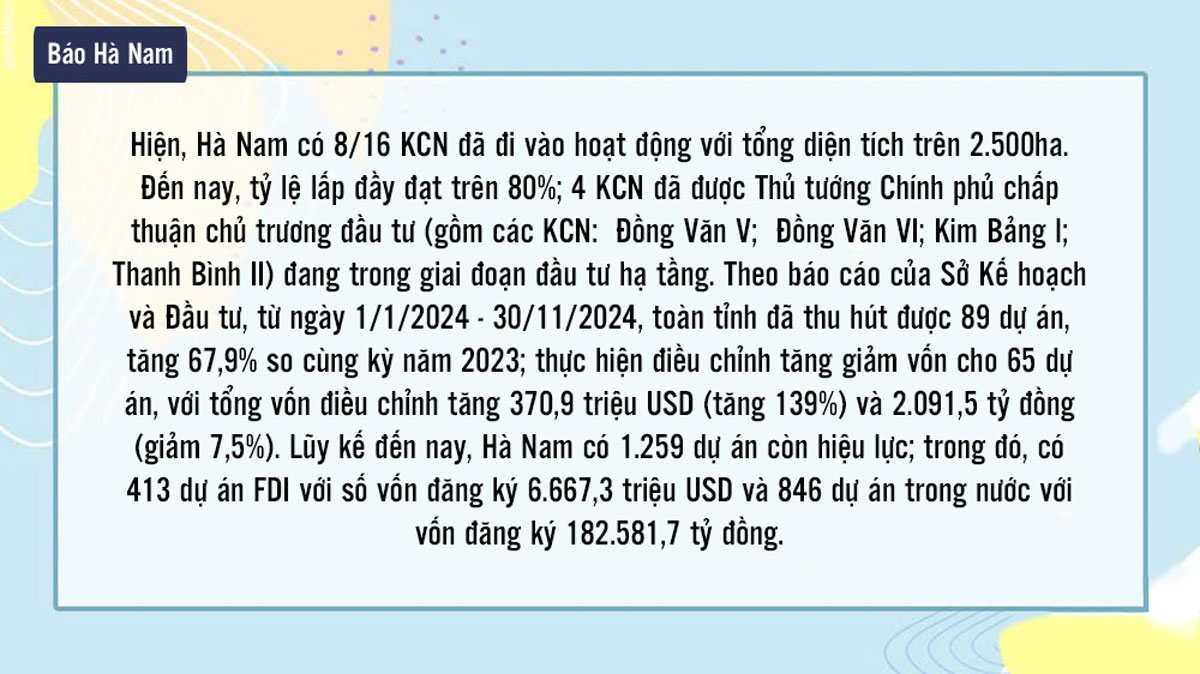 Với mục tiêu xây dựng tỉnh trở thành một trong các trung tâm của vùng đồng bằng sông Hồng và cả nước về công nghiệp công nghệ cao thân thiện với môi trường, là một trong những tỉnh nằm trong nhóm dẫn đầu vùng đồng bằng Bắc Bộ về phát triển công nghiệp, rất nhiều giải pháp đã được Hà Nam triển khai thực hiện hiệu quả trong những năm qua. Quán triệt sâu sắc tinh thần Nghị quyết 11-NQ/TU, ngày 15/9/2021 của Tỉnh ủy Hà Nam khóa XX về đẩy mạnh phát triển công nghiệp, trọng tâm là công nghiệp công nghệ cao, công nghiệp hỗ trợ, chế biến, chế tạo và dịch vụ phục vụ phát triển công nghiệp theo hướng hiện đại, bền vững giai đoạn 2021-2025, định hướng đến năm 2030, từ năm 2021 đến nay, cùng với các giải pháp về đầu tư phát triển hạ tầng giao thông, hạ tầng khu công nghiệp (KCN), Hà Nam đã đẩy mạnh cải cách thủ tục hành chính; tập trung tháo gỡ khó khăn vướng mắc cho doanh nghiệp (DN); thực hiện hiệu quả 10 cam kết của tỉnh đối với nhà đầu tư. Từ đó, tạo bước chuyển mạnh về chất trong lĩnh vực thu hút đầu tư, phát triển công nghiệp. Hiện, Hà Nam có 8/16 KCN đã đi vào hoạt động với tổng diện tích trên 2.500ha. Đến nay, tỷ lệ lấp đầy đạt trên 80%; 4 KCN đã được Thủ tướng Chính phủ chấp thuận chủ trương đầu tư (gồm các KCN: Đồng Văn V; Đồng Văn VI; Kim Bảng I; Thanh Bình II) đang trong giai đoạn đầu tư hạ tầng. Theo báo cáo của Sở Kế hoạch và Đầu tư, từ ngày 1/1/2024 - 30/11/2024, toàn tỉnh đã thu hút được 89 dự án, tăng 67,9% so cùng kỳ năm 2023; thực hiện điều chỉnh tăng giảm vốn cho 65 dự án, với tổng vốn điều chỉnh tăng 370,9 triệu USD (tăng 139%) và 2.091,5 tỷ đồng (giảm 7,5%). Lũy kế đến nay, Hà Nam có 1.259 dự án còn hiệu lực; trong đó, có 413 dự án FDI với số vốn đăng ký 6.667,3 triệu USD và 846 dự án trong nước với vốn đăng ký 182.581,7 tỷ đồng. Bà Vũ Thị Minh Phượng, Phó Trưởng Ban quản lý các KCN tỉnh, cho biết: Để công nghiệp tiếp tục phát huy vai trò trụ đỡ quan trọng của nền kinh tế, thời gian tới, ban tiếp tục tham mưu cải thiện hơn nữa môi trường thu hút đầu tư, trọng tâm là cải cách thủ tục hành chính; đồng thời, cung cấp đầy đủ dịch vụ chất lượng cao cho nhà đầu tư tại các KCN. Không chỉ quan tâm tới những nhà đầu tư đã và đang thực hiện các dự án đầu tư trên địa bàn tỉnh, Hà Nam sẽ đẩy nhanh công tác quy hoạch các KCN giai đoạn mới để thu hút đầu tư...