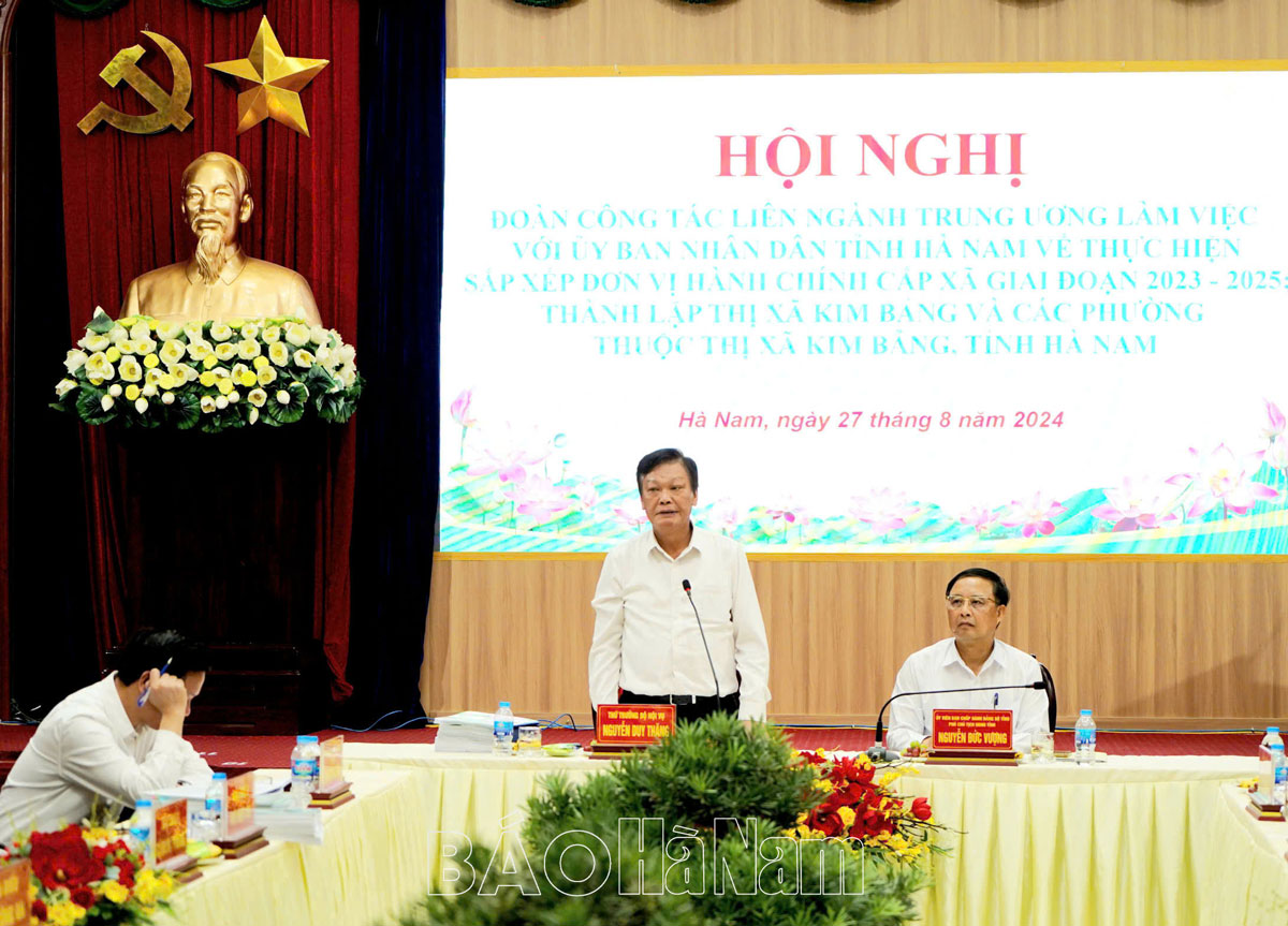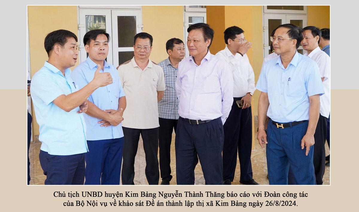 Theo chủ trương, chỉ đạo của tỉnh và cũng là mục tiêu được đặt ra ngay trong chủ đề của Đại hội Đảng bộ huyện khóa XXVI, nhiệm kỳ 2020-2025, Kim Bảng phấn đấu trở thành thị xã trước năm 2025. Chiều ngày 26/8 vừa qua, Đoàn công tác của Bộ Nội vụ do Thứ trưởng Nguyễn Duy Thăng làm trưởng đoàn về khảo sát việc sắp xếp đơn vị hành chính cấp xã giai đoạn 2023-2025 tại tỉnh và việc thành lập thị xã Kim Bảng và các phường thuộc thị xã Kim Bảng.