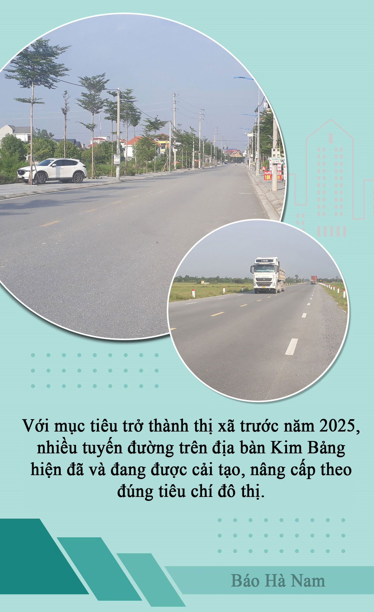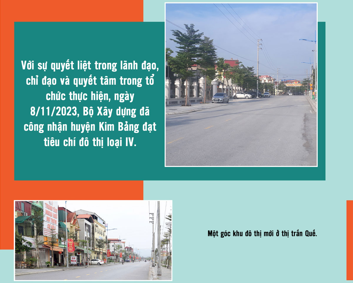 Theo Trưởng phòng Kinh tế - Hạ tầng huyện Kim Bảng Vũ Hoàng Long, ngay sau Đại hội, Huyện ủy đã ban hành nghị quyết chuyên đề về vấn đề này. Thực hiện Nghị quyết của Huyện ủy, phòng Kinh tế - Hạ tầng đã chủ trì, phối hợp với các cơ quan, đơn vị tham mưu UBND huyện ban hành các kế hoạch tổ chức thực hiện; cùng với đó tham mưu UBND huyện phối hợp chặt chẽ với Sở Xây dựng lập quy hoạch phân khu tỷ lệ 1/2000 các khu chức năng theo quy hoạch chung đô thị Kim Bảng; tham mưu tổ chức lập, trình thẩm định, phê duyệt Chương trình phát triển đô thị Kim Bảng đến năm 2030, Quy chế quản lý kiến trúc đô thị Kim Bảng và Đề án đề nghị công nhận huyện Kim Bảng đạt tiêu chí đô thị loại IV. Đây là các nhiệm vụ quan trọng làm cơ sở để hoàn thành mục tiêu Nghị quyết của Huyện ủy về nâng cấp huyện Kim Bảng đạt tiêu chí đô thị loại IV, chuẩn bị các điều kiện để tiến tới thành lập thị xã trước năm 2025. Cùng với đó, tham mưu UBND huyện lập Báo cáo đánh giá trình độ phát triển cơ sở hạ tầng đối với 11 xã, thị trấn trong phạm vi khu vực nội thị; chỉ đạo rà soát, đánh giá các chỉ tiêu phát triển cơ sở hạ tầng, kinh tế - xã hội theo các tiêu chuẩn của phường thuộc thị xã; phối hợp lập, trình thẩm định Đề án thành lập thị xã theo chủ trương của UBND tỉnh. Với sự quyết liệt trong lãnh đạo, chỉ đạo và quyết tâm trong tổ chức thực hiện, ngày 8/11/2023, Bộ Xây dựng đã công nhận huyện Kim Bảng đạt tiêu chí đô thị loại IV.