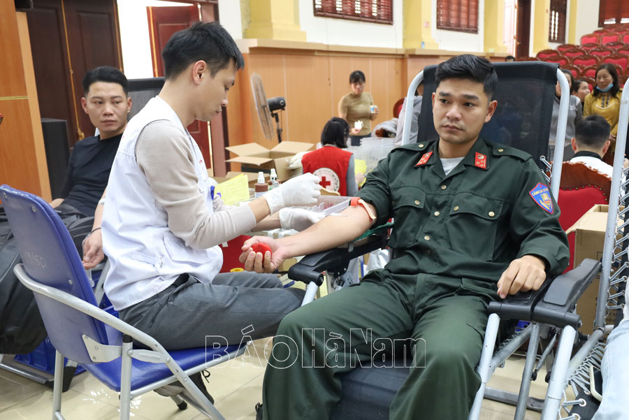 Các tình nguyện viên lực lượng vũ trang tham gia hiến máu.