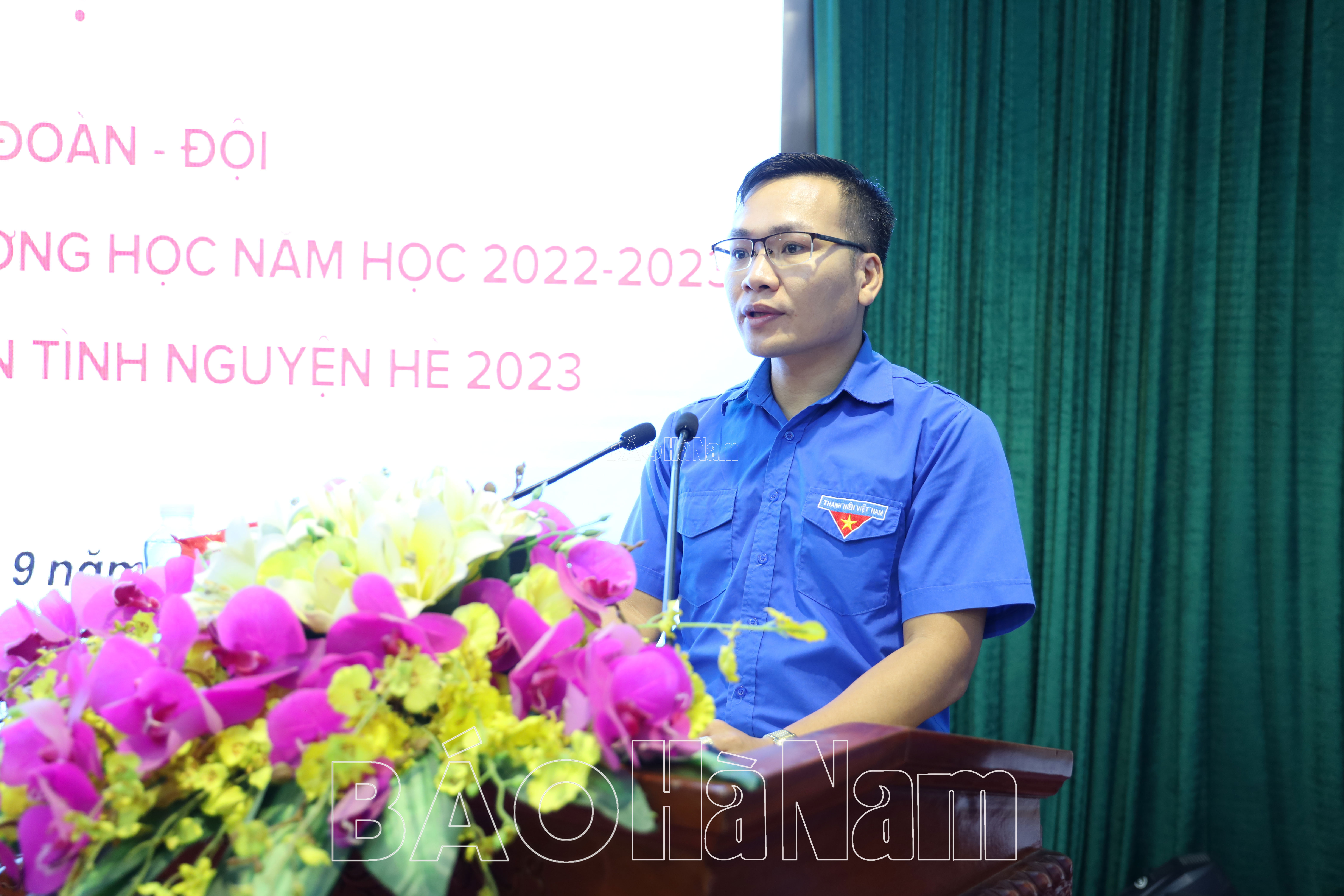Bí thư Huyện đoàn Kim Bảng Nguyễn Văn Hiếu báo cáo kết quả công tác Đoàn, Đội và phong trào thanh thiếu nhi năm học 2022-2023 trên địa bàn huyện.