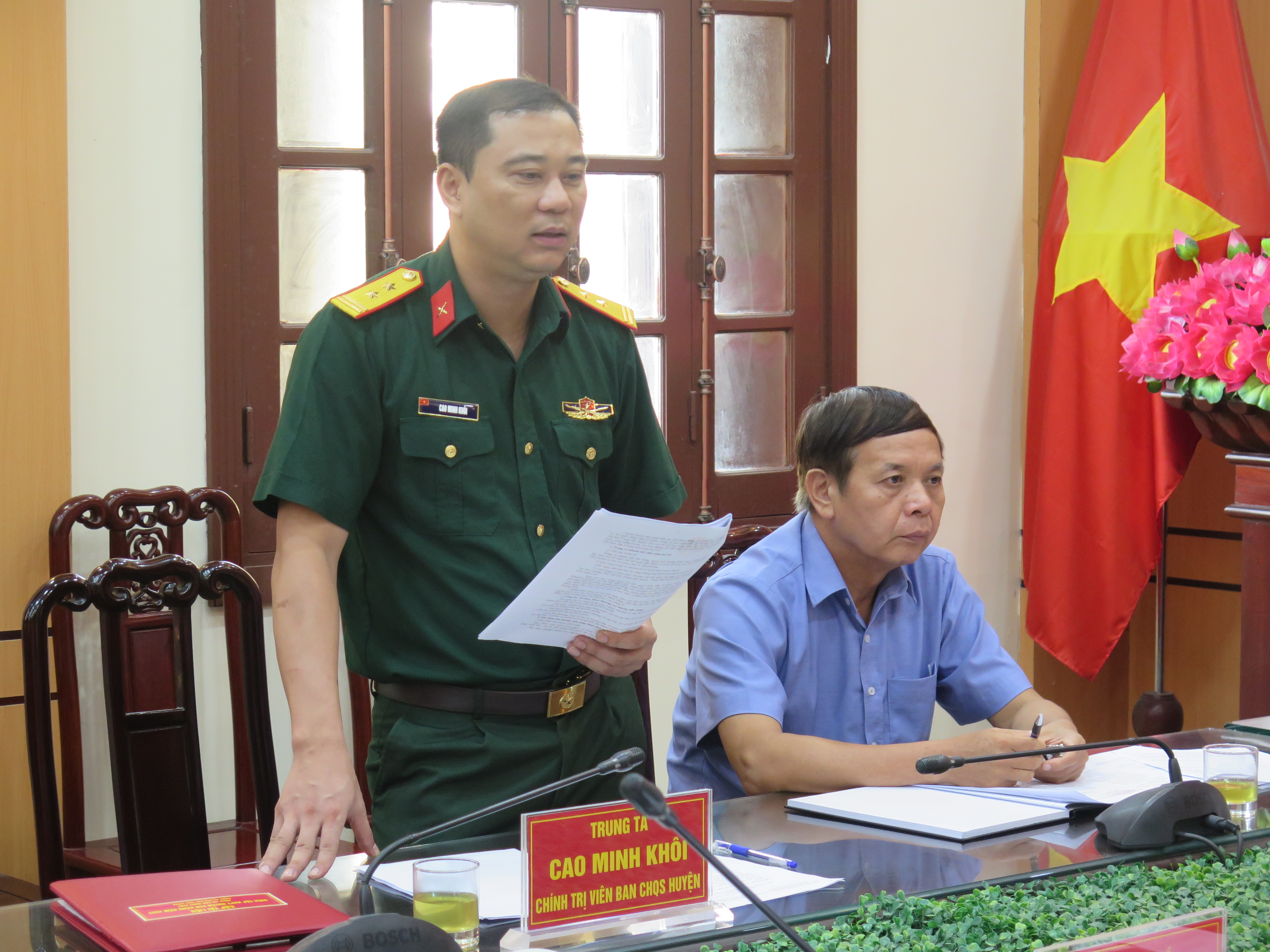 Đại diện Ban CHQS huyện Kim Bảng trình bày kế hoạch trang trí, khánh tiết, thi đua, tuyên truyền phục vụ diễn tập.
