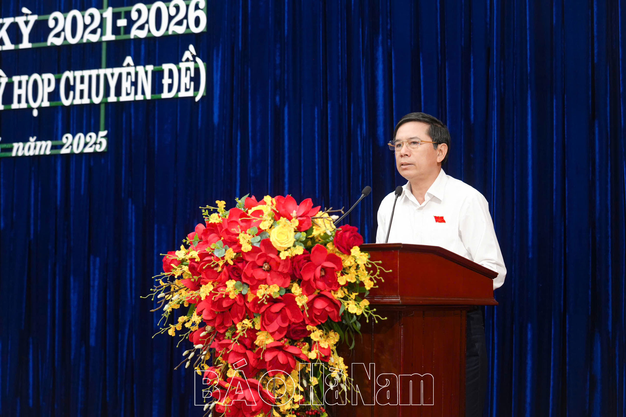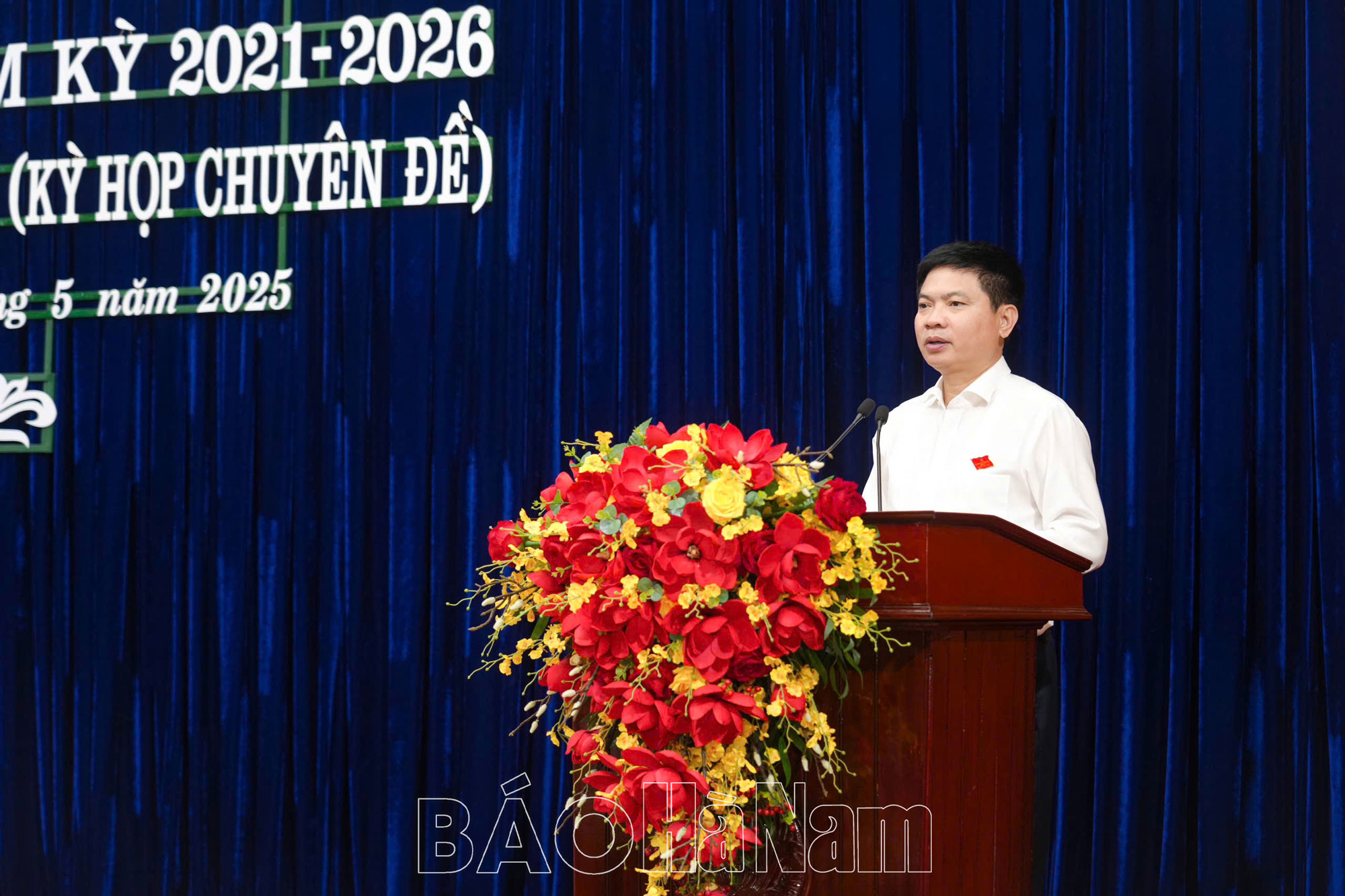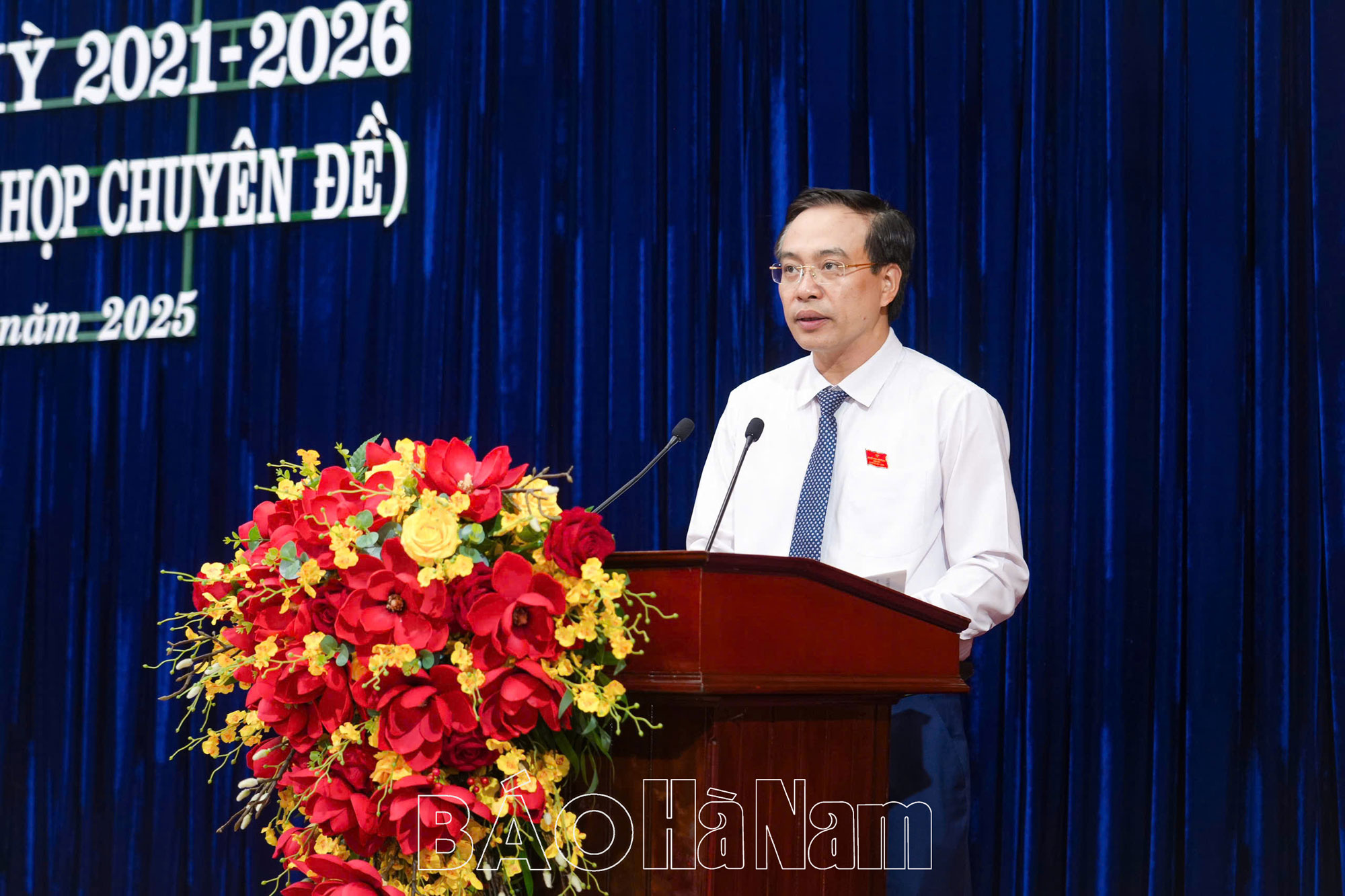 Tiếp theo Kỳ họp đã nghe lãnh đạo UBND tỉnh, các ủy viên UBND tỉnh trình bày 9 tờ trình đề nghị ban hành nghị quyết thuộc các lĩnh vực tài chính - đầu tư, cơ chế, chính sách hỗ trợ thực hiện dự án đầu tư xây dựng nhà ở xã hội, hỗ trợ sản xuất nông nghiệp và lĩnh vực đất đai, lâm nghiệp. Cụ thể: Nghị quyết về cam kết hỗ trợ vốn đầu tư phát triển của ngân sách cấp tỉnh cho Bệnh viện Lão khoa Trung ương để thực hiện dự án đầu tư xây dựng Bệnh viện Lão khoa Trung ương cơ sở 2; Nghị quyết về điều chỉnh, bổ sung danh mục các khu đất thực hiện đấu thầu lựa chọn nhà đầu tư dự án đầu tư có sử dụng đất trên địa bàn tỉnh Hà Nam năm 2025 (lần thứ 4); Nghị quyết quy định cơ chế hỗ trợ thực hiện dự án đầu tư xây dựng nhà ở xã hội trên địa bàn tỉnh Hà Nam; Nghị quyết sửa đổi Nghị quyết số 86/NQ-HĐND ngày 06/12/2024 của HĐND tỉnh Hà Nam về dự toán ngân sách tỉnh Hà Nam và phương án phân bổ ngân sách cấp tỉnh năm 2025; Nghị quyết điều chỉnh và giao chi tiết Kế hoạch đầu tư công trung hạn giai đoạn 2021-2025; Nghị quyết điều chỉnh và giao chi tiết Kế hoạch đầu tư công năm 2025 (lần 7); Nghị quyết về danh mục các công trình, dự án phải thu hồi đất, dự án phải chuyển mục đích sử dụng đất mà có diện tích đất trồng lúa, đất rừng sản xuất điều chỉnh, bổ sung năm 2025 trên địa bàn tỉnh Hà Nam; Nghị quyết quy định thẩm quyền quyết định thanh lý rừng trồng thuộc sở hữu toàn dân trên địa bàn tỉnh Hà Nam; Nghị quyết quy định mức hỗ trợ sản xuất nông nghiệp để khôi phục sản xuất vùng bị thiệt hại do thiên tai, dịch hại thực vật trên địa bàn tỉnh Hà Nam. Kỳ họp cũng nghe các báo cáo thẩm tra của các ban HĐND tỉnh về các tờ trình, dự thảo nghị quyết của Kỳ họp.