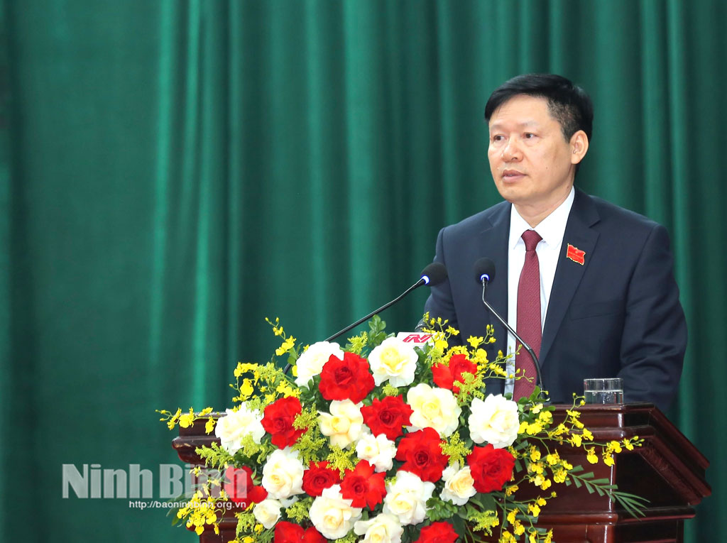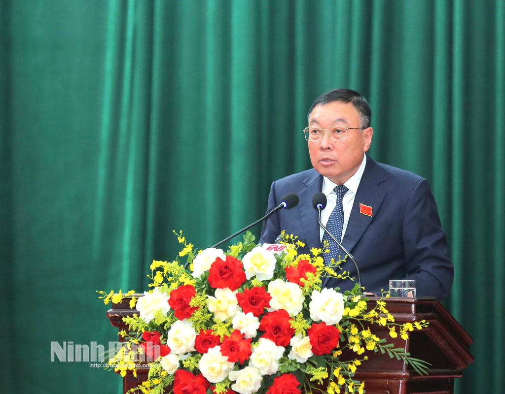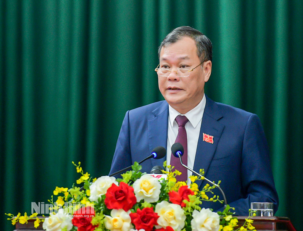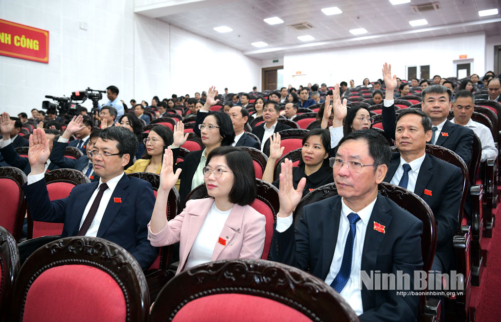Mở đầu phiên họp buổi sáng, đại biểu HĐND tỉnh đã nghe Tờ trình, dự thảo Nghị quyết về việc cho thôi làm nhiệm vụ đại biểu Hội đồng nhân dân tỉnh khóa XV, nhiệm kỳ 2021-2026 đối với đồng chí Trương Quốc Huy, nguyên Bí thư Tỉnh ủy, nguyên Trưởng Đoàn đại biểu Quốc hội tỉnh, đại biểu HĐND tỉnh Ninh Bình, do chuyển công tác khỏi địa bàn tỉnh Ninh Bình; đồng chí Phạm Quang Ngọc, nguyên Phó Bí thư Tỉnh ủy, nguyên Chủ tịch UBND tỉnh, đại biểu HĐND tỉnh Ninh Bình, do chuyển công tác khỏi địa bàn tỉnh Ninh Bình. 100% đại biểu đã biểu quyết thông qua Nghị quyết về việc cho thôi làm nhiệm vụ đại biểu HĐND tỉnh khóa XV, nhiệm kỳ 2021 - 2026.