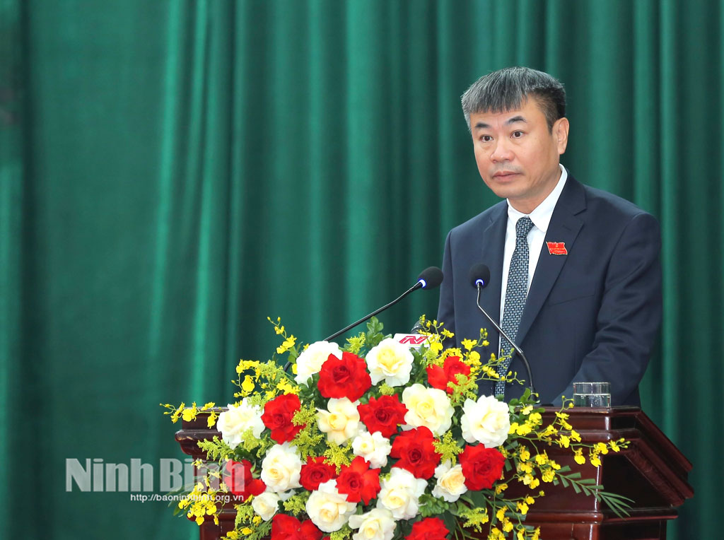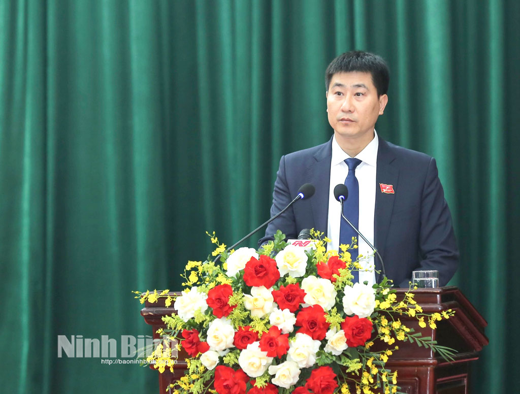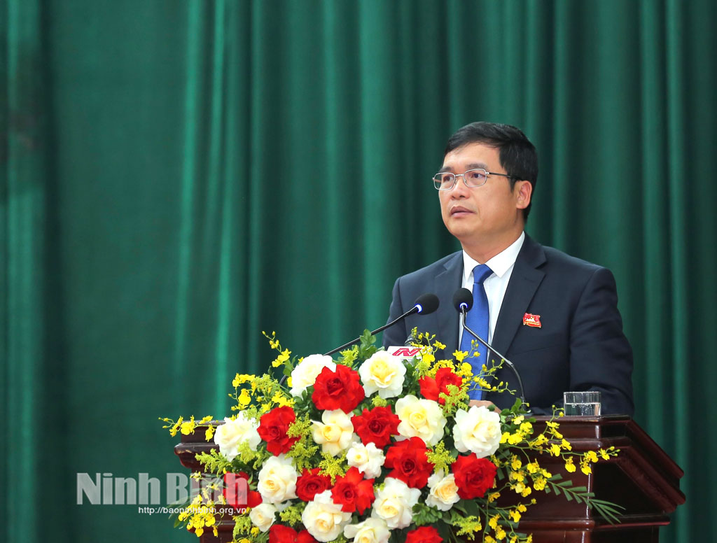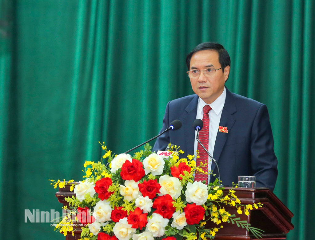 Mở đầu phiên họp buổi sáng, đại biểu HĐND tỉnh đã nghe Tờ trình, dự thảo Nghị quyết về việc cho thôi làm nhiệm vụ đại biểu Hội đồng nhân dân tỉnh khóa XV, nhiệm kỳ 2021-2026 đối với đồng chí Trương Quốc Huy, nguyên Bí thư Tỉnh ủy, nguyên Trưởng Đoàn đại biểu Quốc hội tỉnh, đại biểu HĐND tỉnh Ninh Bình, do chuyển công tác khỏi địa bàn tỉnh Ninh Bình; đồng chí Phạm Quang Ngọc, nguyên Phó Bí thư Tỉnh ủy, nguyên Chủ tịch UBND tỉnh, đại biểu HĐND tỉnh Ninh Bình, do chuyển công tác khỏi địa bàn tỉnh Ninh Bình. 100% đại biểu đã biểu quyết thông qua Nghị quyết về việc cho thôi làm nhiệm vụ đại biểu HĐND tỉnh khóa XV, nhiệm kỳ 2021 - 2026.