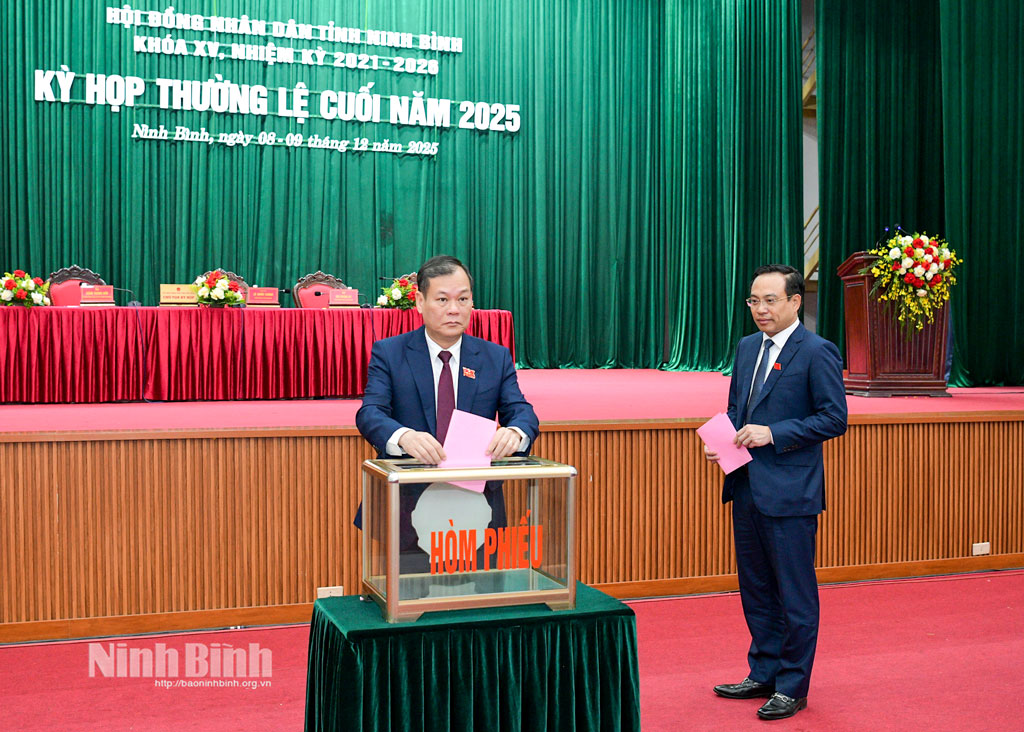 Cũng tại Kỳ họp, HĐND tỉnh đã tiến hành quy trình bầu bổ sung chức danh Ủy viên UBND tỉnh Ninh Bình khóa XV, nhiệm kỳ 2021-2026 đối với: đồng chí Thượng tá Cù Quốc Thắng, Bí thư Đảng ủy, Giám đốc Công an tỉnh; đồng chí Lê Văn Cường, Tỉnh ủy viên, Chánh Thanh tra tỉnh Ninh Bình. 100% đại biểu tham gia bầu cử nhất trí tán thành.