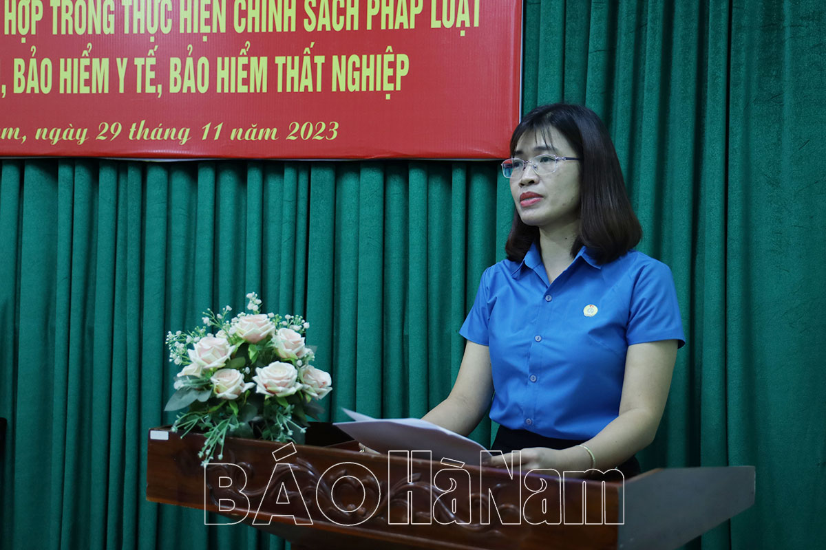 Chủ tịch LĐLĐ huyện Thanh Liêm Trịnh Thu Trang trình bày nội dung chương trình phối hợp.