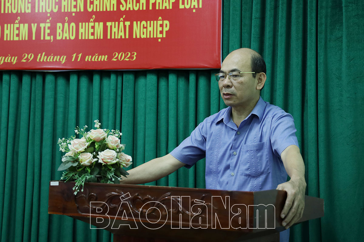 Giám đốc BHXH huyện Thanh Liêm Trần Đức Minh tiếp thu ý kiến chỉ đạo của đồng chí Phó Bí thư Thường trực Huyện ủy để thực hiện hiệu quả chương trình phối hợp giữa BHXH và LĐLĐ huyện.