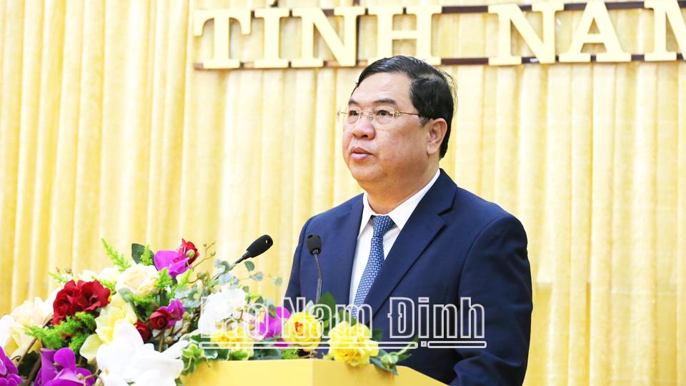 | Đồng chí Phạm Gia Túc, Ủy viên BCH Trung ương Đảng, Bí thư Tỉnh ủy phát biểu tại hội nghị. |