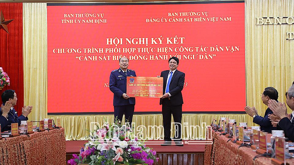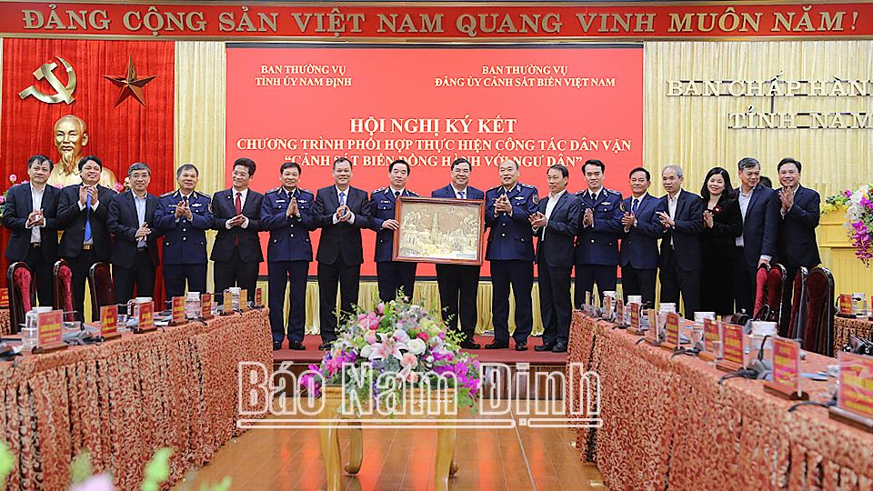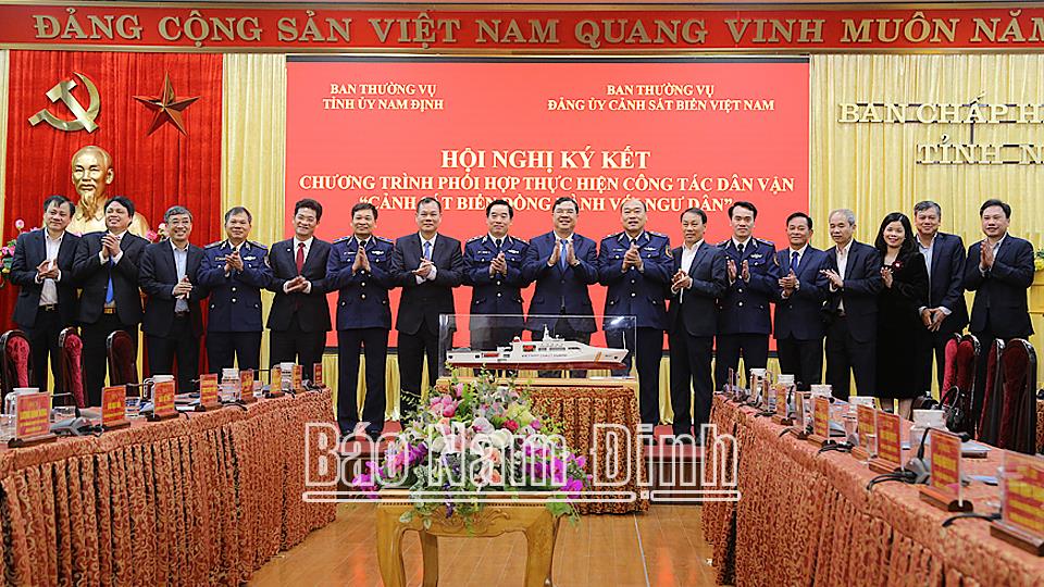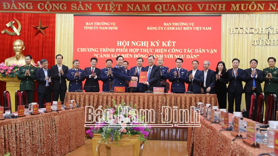 | Ban TVTU Nam Định và Ban Thường vụ Đảng ủy Cảnh sát biển Việt Nam ký kết chương trình phối hợp thực hiện công tác dân vận “Cảnh sát biển đồng hành với ngư dân”. |