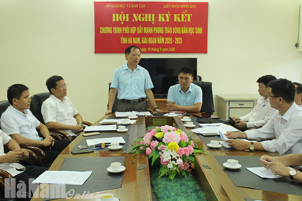 Chiều 14/9, Sở Giáo dục và Đào tạo (GDĐT) phối hợp với Liên đoàn Bóng bàn tỉnh tổ chức hội nghị ký kết phối hợp đẩy mạnh phát triển phong trào bóng bàn học sinh tỉnh Hà Nam giai đoạn 2020 – 2023 và Biên bản ghi nhớ về việc tài trợ giải bóng bàn học sinh các câu lạc bộ (CLB) tỉnh Hà Nam.