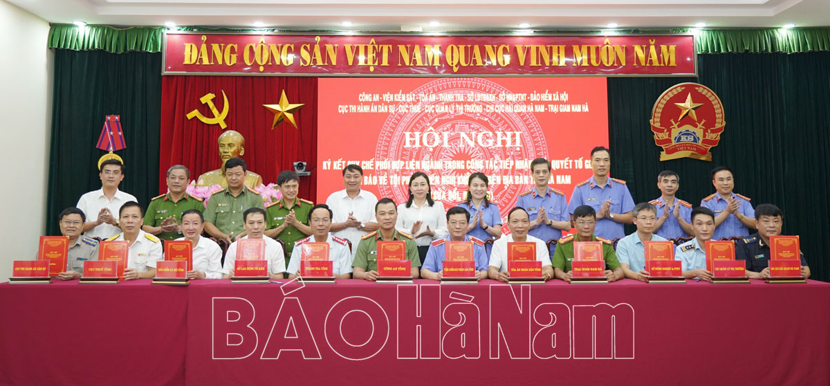 Chiều ngày 20/9, Viện Kiểm sát nhân dân tỉnh Hà Nam chủ trì phối hợp với các cơ quan: Công an tỉnh, Tòa án nhân dân tỉnh, Thanh tra tỉnh, Sở Lao động - Thương binh và Xã hội, Sở Nông nghiệp và Phát triển nông thôn, Bảo hiểm xã hội tỉnh, Cục Thi hành án dân sự, Cục Thuế, Cục Quản lý thị trường, Chi cục Hải quan Hà Nam và Trại giam Nam Hà (Cục C10 - Bộ Công an), Sở Y tế tỉnh Hà Nam, Sở Thông tin và Truyền thông, Báo Hà Nam, Đài Phát thanh và Truyền hình Hà Nam tổ chức hội nghị ký kết các Quy chế phối hợp liên ngành (sửa đổi, bổ sung) trong công tác tiếp nhận, giải quyết tố giác, tin báo về tội phạm; kiến nghị khởi tố; tuyên truyền pháp luật; giám định pháp y trên địa bàn.