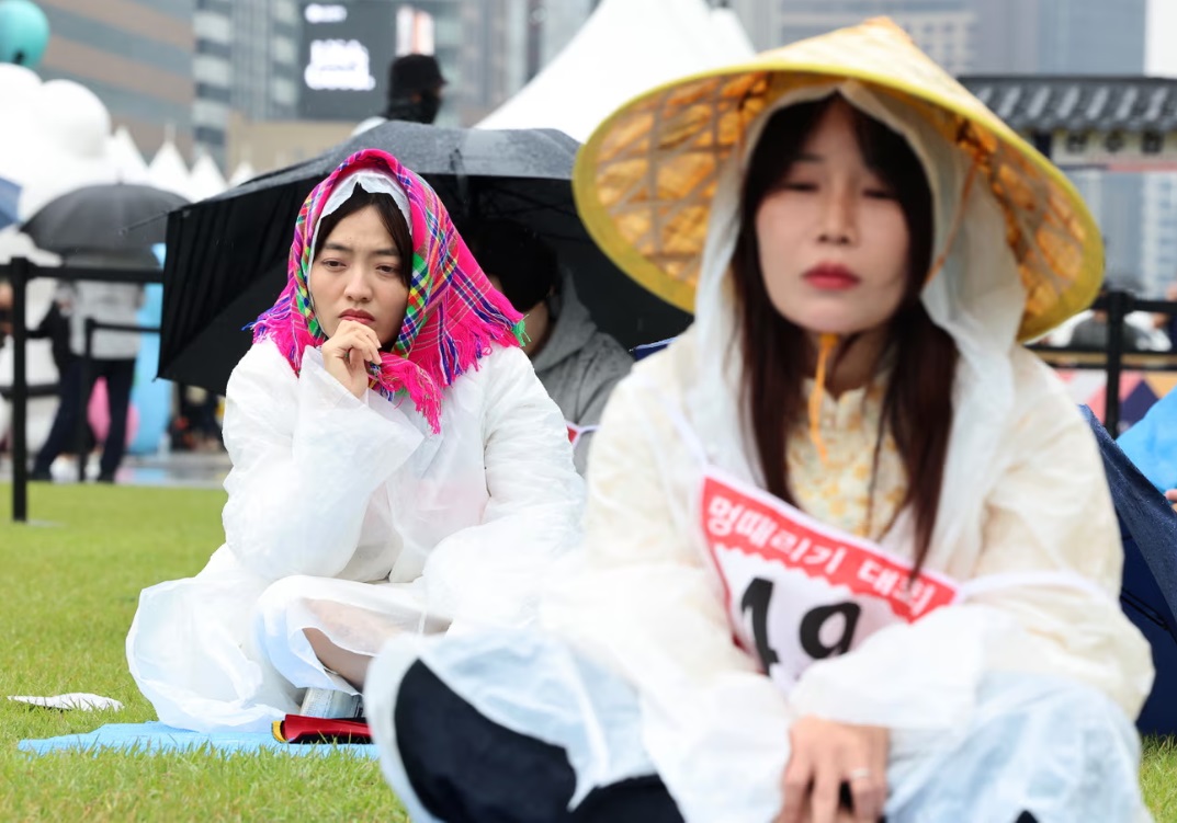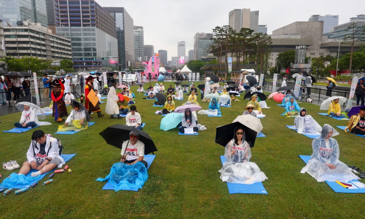 Phía trước cung điện Kyungbokgung nổi tiếng ở trung tâm thành phố Seoul (Hàn Quốc), hàng chục người ở mọi lứa tuổi ngồi yên trên những tấm thảm yoga dưới mưa, vô định nhìn vào không gian.