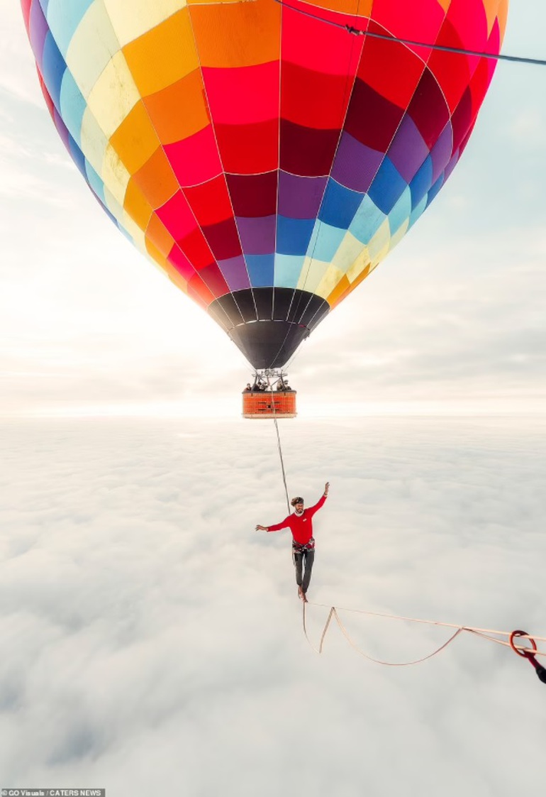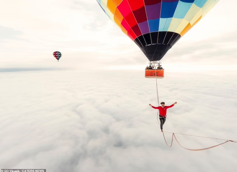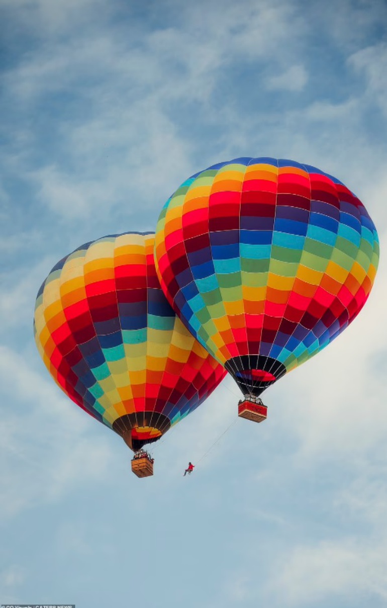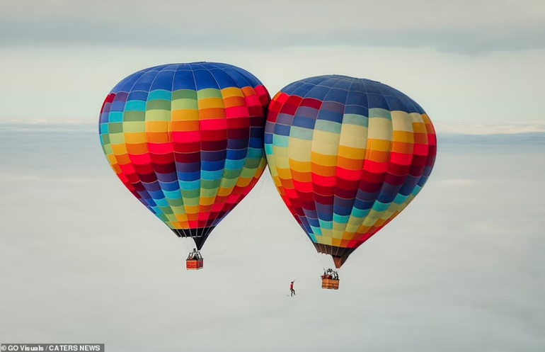 Một người đàn ông Brazil 34 tuổi vừa phá kỷ lục thế giới khi bước đi trên dây giữa hai quả khinh khí cầu ở độ cao gần 1.900 mét (Ảnh: Daily Mail).