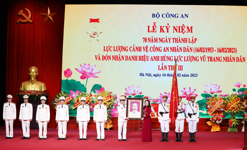 Tại lễ kỷ niệm, Quyền Chủ tịch nước Võ Thị Ánh Xuân trao danh hiệu Anh hùng Lực lượng vũ trang nhân dân tặng lực lượng Cảnh vệ Công an nhân dân.